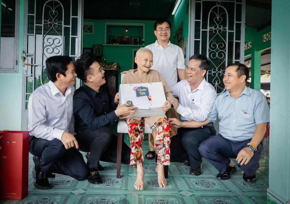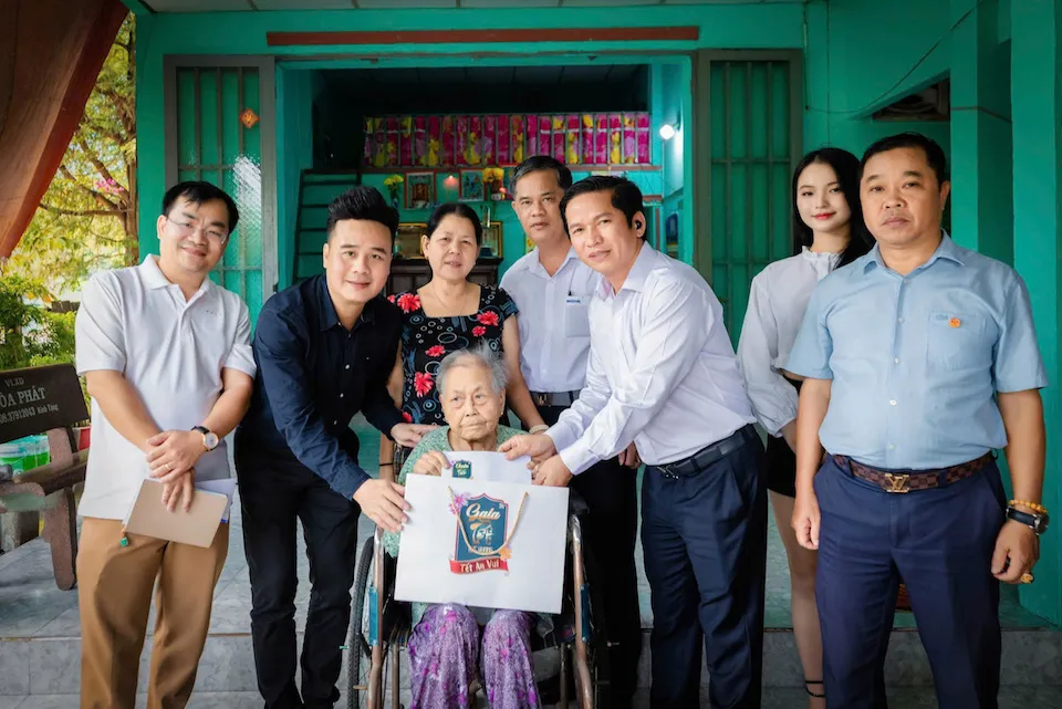 Ông Trần Đình Quý - Chủ tịch HĐQT, Tổng Giám đốc Công ty Cổ phần Nông nghiệp Quốc tế VinaStar (ngoài cùng bên trái) cùng BTC chương trình Gala Tết Quê Hương 2026 ân cần thăm hỏi sức khỏe Mẹ Việt Nam Anh hùng Lê Thị Phiền (90 tuổi), người đã hiến dâng chồng và con cho sự nghiệp giải phóng dân tộc.