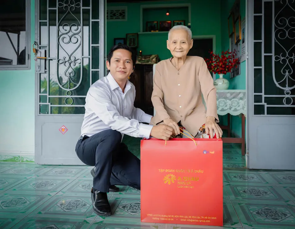 Ông Mai Văn Thuận - Chủ tịch HĐQT Tập đoàn Quốc tế Á Châu thăm hỏi và trao quà tri ân Mẹ Việt Nam Anh hùng Huỳnh Thị Lơ.