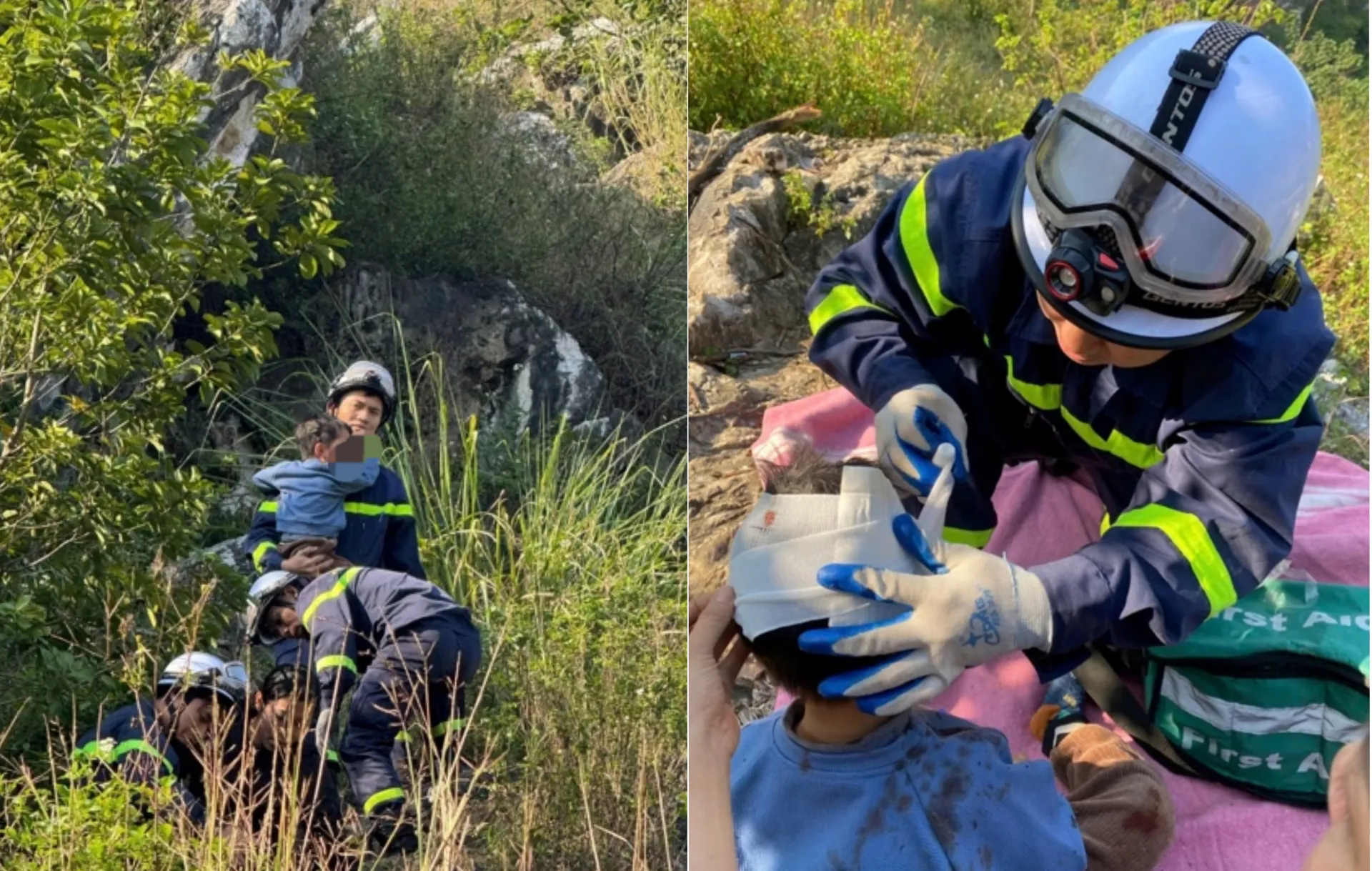 Hà Nội: 2 cháu bé bị mắc kẹt dưới hố sâu ở núi Trầm được cảnh sát giải cứu