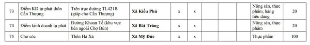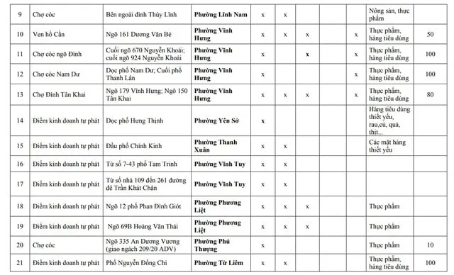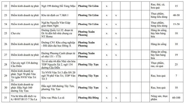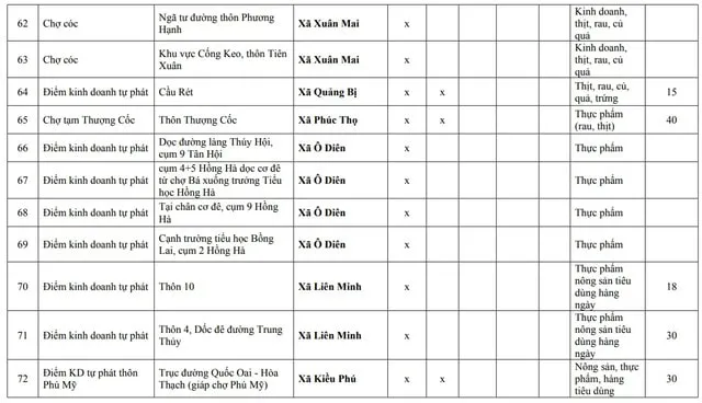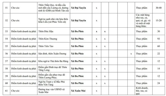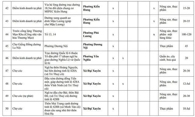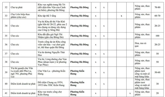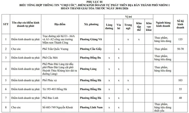 Chi tiết 75 điểm thuộc nhóm 1, tức nhóm hoàn thành giải tỏa trước ngày 30/1/2026, như sau: Phường Hà Đông và xã Đa Phúc là một trong những khu vực tập trung nhiều nhất với 8 điểm trong danh sách hoàn thành giải tỏa trước ngày 30/1/2026. Trong đó, phường Hà Đông có cả chợ tự phát và chợ cóc nằm rải rác ở các vị trí như khu nghĩa trang Hà Trì, vỉa hè Khu đô thị Văn Khê, hay khu đất đấu giá Ngô Thì Nhậm, vỉa hè đường Nguyễn Thái Học...