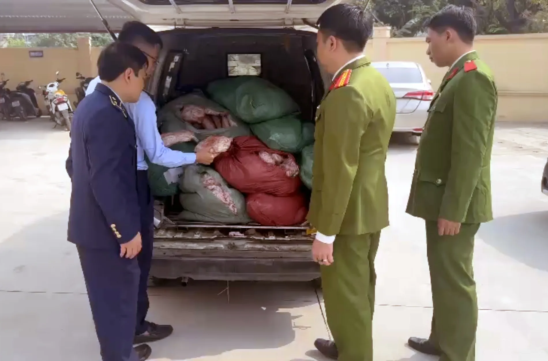 QLTT Hà Nội phối hợp với lực lượng công an Sóc Sơn phát hiện xe ô tô vận chuyển chân gà nhập lậu không đảm bảo vệ sinh an toàn thực phẩm. Ảnh: Hoài Nam