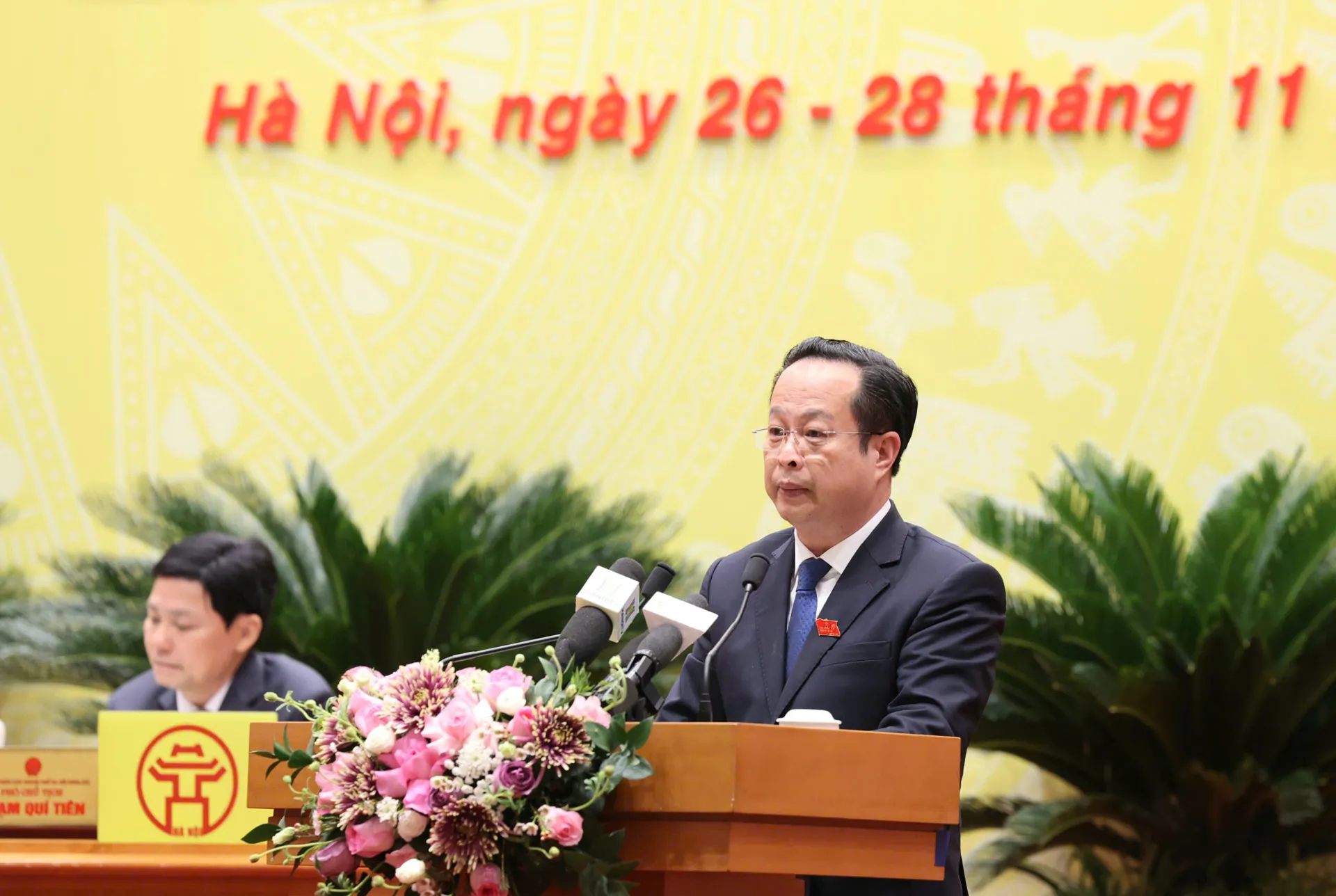 Phó Chủ tịch Thường trực HĐND TP Hà Nội Trần Thế Cương trình bày báo cáo