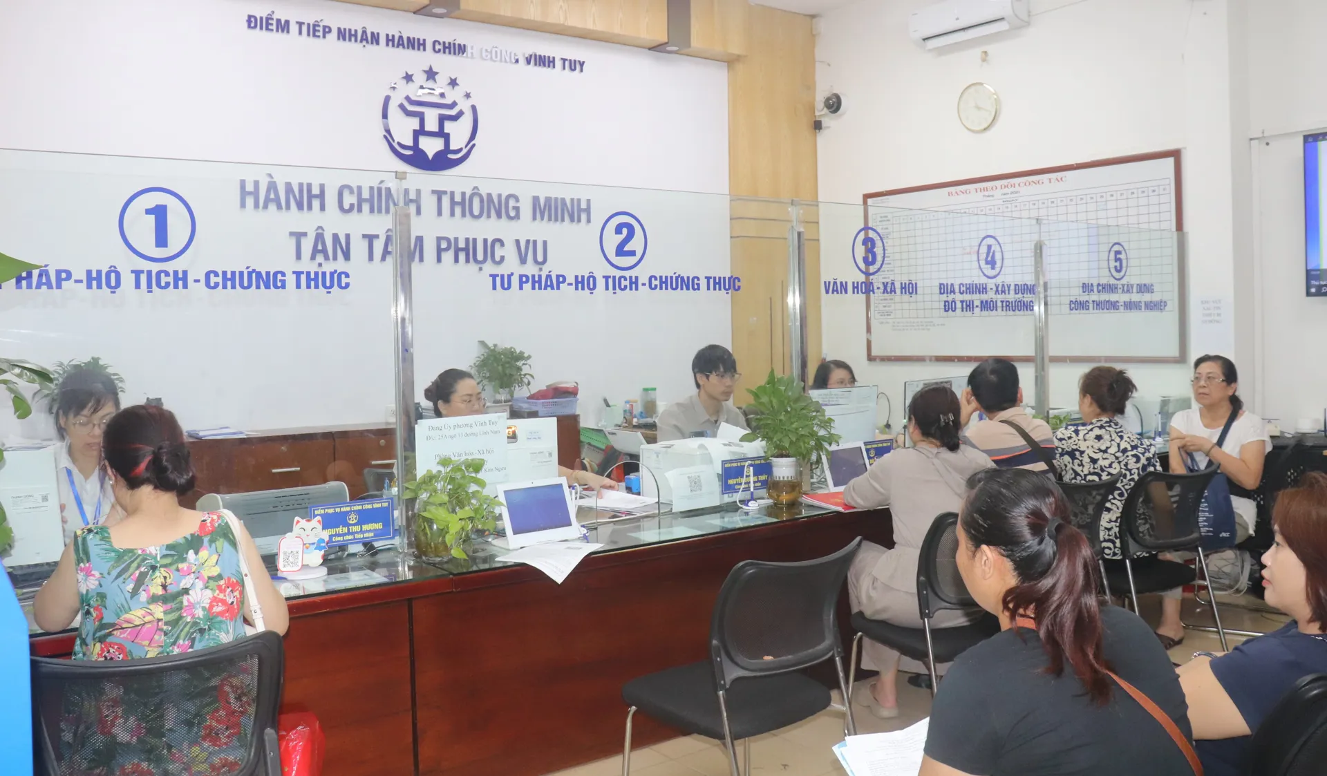 UBND TP Hà Nội yêu cầu trong năm 2025 cắt giảm ít nhất 30% thời gian, chi phí thực hiện thủ tục hành chính liên quan hoạt động sản xuất kinh doanh (ảnh: Điểm Phục vụ hành chính công phường Vĩnh Tuy phục vụ người dân, DN giải quyết hồ sơ hành chính)