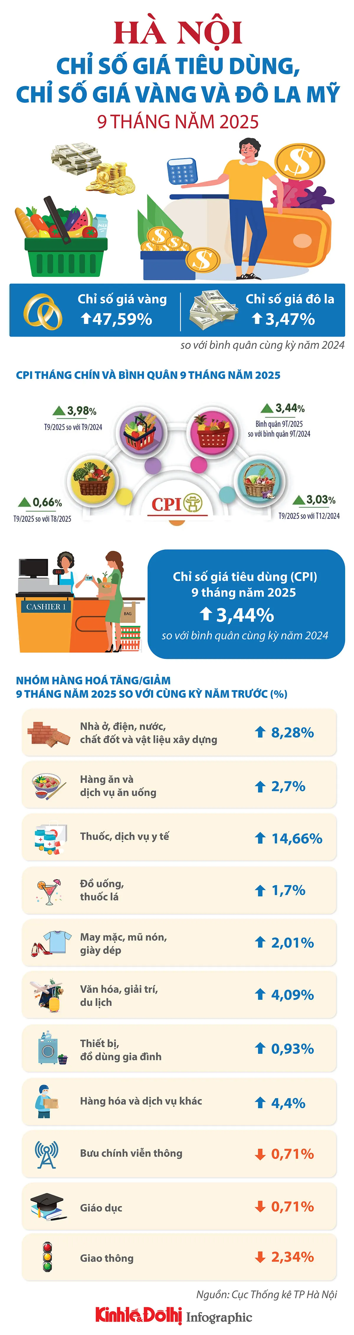 Kinhtedothi - Theo Cục Thống kê TP Hà Nội, bình quân 9 tháng năm 2025 chỉ số giá tiêu dùng (CPI) tăng 3,44%, chỉ số giá vàng tăng 49,25%, chỉ số giá đô la Mỹ tăng 3,81% so với bình quân 9 tháng năm trước...