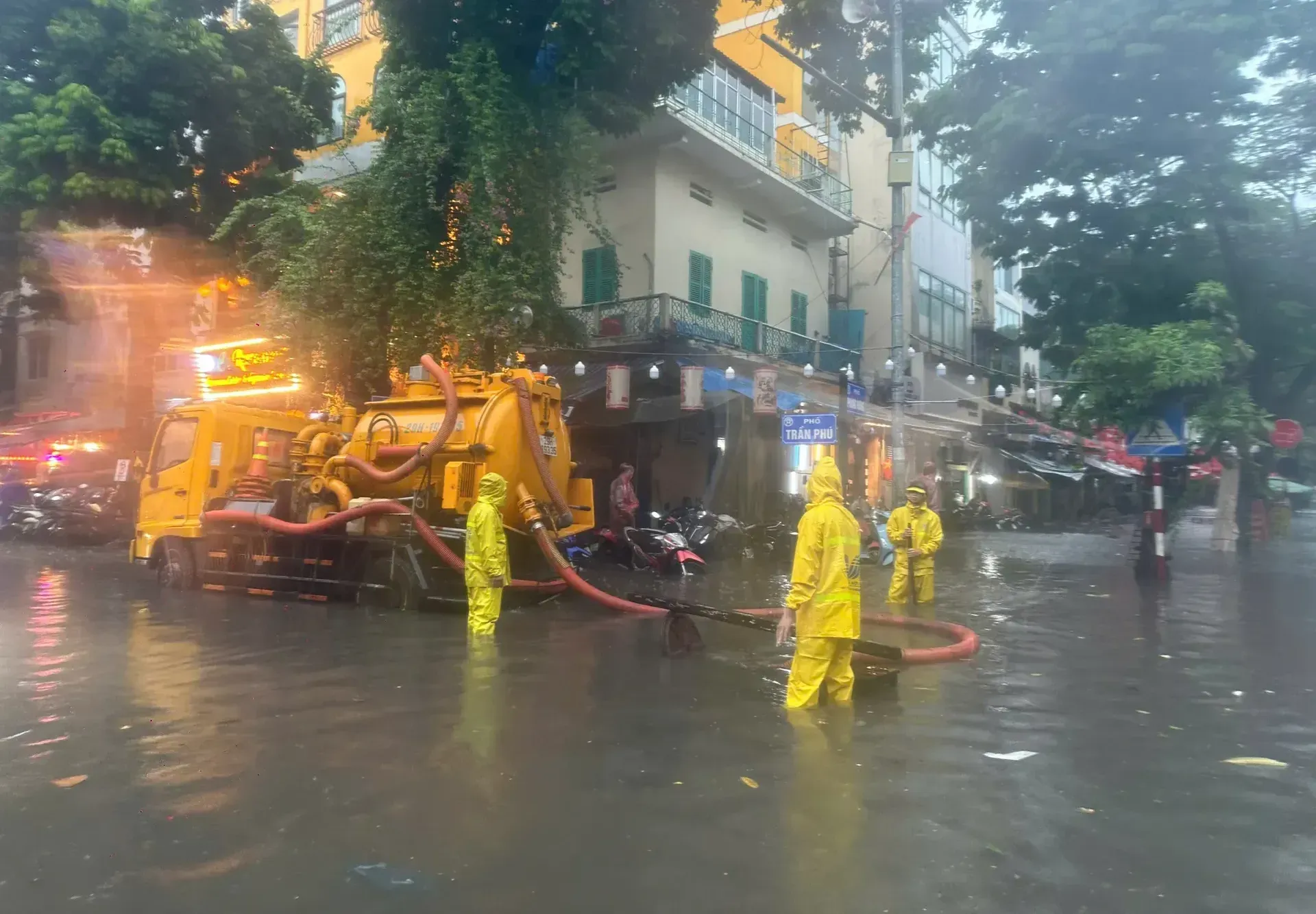 Xí nghiệp Thi công cơ giới cùng nhiều máy móc, thiết bị làm nhiệm vụ thoát nước trên đường phố. Ảnh: Quý Nguyễn