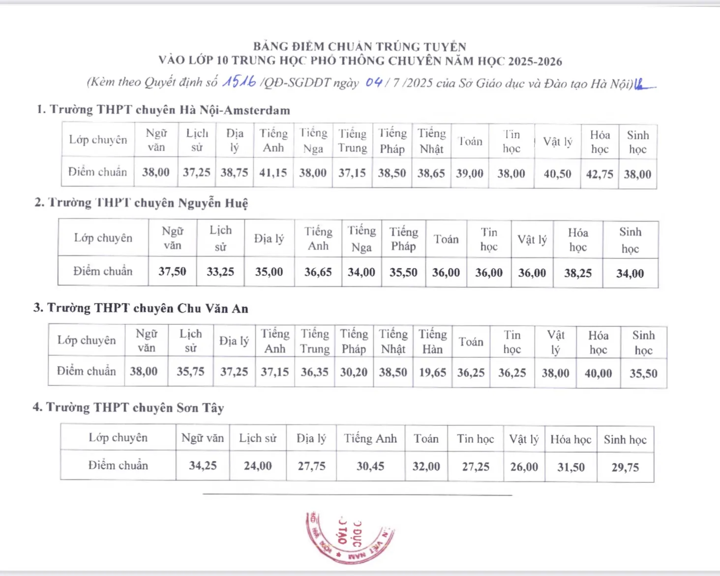 Điểm chuẩn cụ thể các khối chuyên của 4 trường THPT chuyên của Hà Nội năm học 2025 – 2026 như sau: