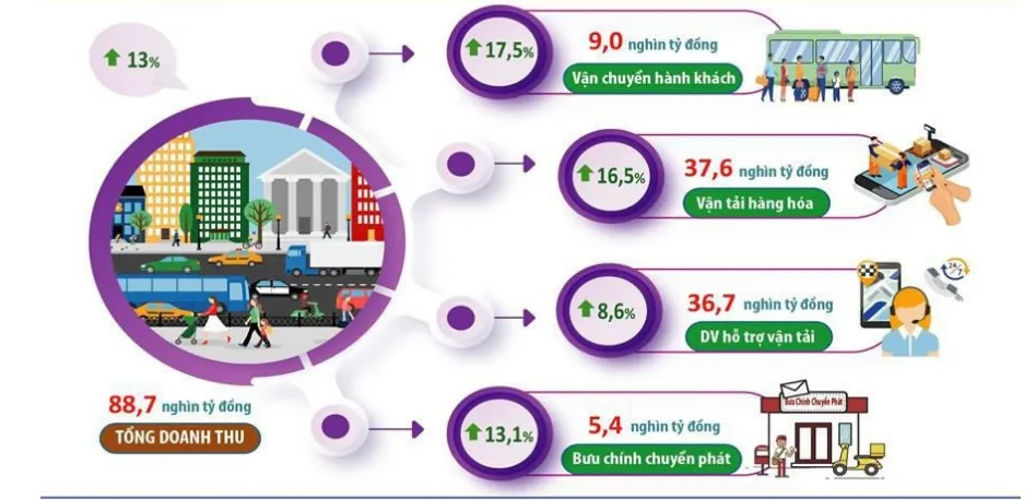 Doanh thu hoạt động hỗ trợ vận tải trong tháng Năm ước tính ạt 7,7 nghìn tỷ đồng, tăng 0,9% so với tháng trước và tăng 12,6% so với cùng kỳ. Tính chung 5 tháng đầu năm 2024, doanh thu đạt 36,7 nghìn tỷ đồng, tăng 8,6% so với cùng kỳ năm trước.