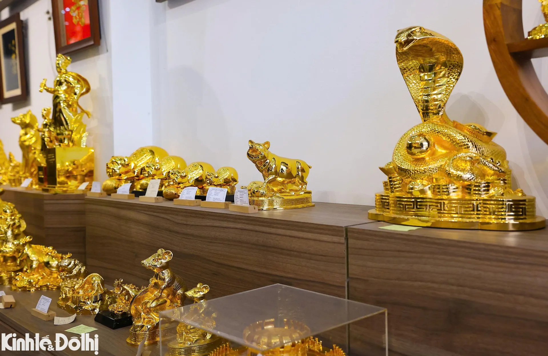 Mỗi dịp Tết Nguyên đán, các cửa hàng vàng bạc, đá quý lại rực rỡ trưng bày bộ sưu tập linh vật 12 con giáp mạ vàng 24K, thu hút khách mua làm quà biếu, cầu may mắn.