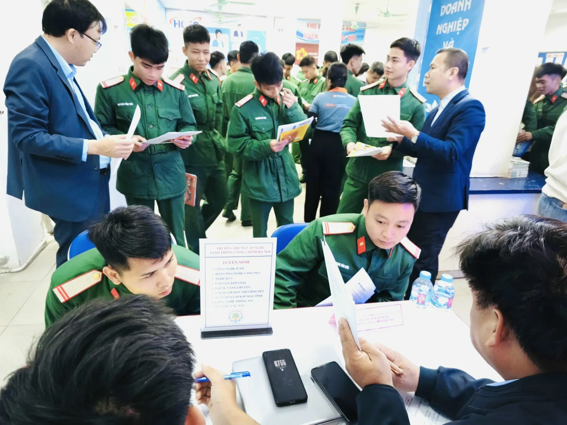Cán bộ Trường Trung cấp nghề Giao thông công chính Hà Nội đang giới thiệu các ngành nghề đào tạo tới quân nhân sắp hoàn thành nghĩa vụ quân sự.