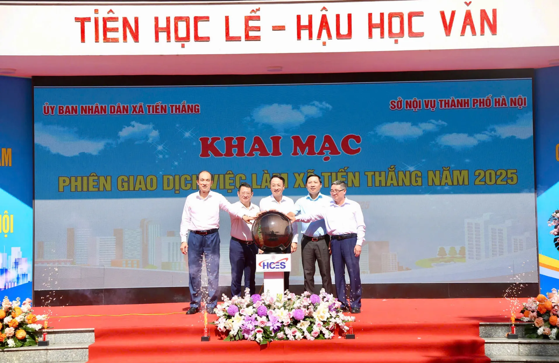 Các đại biểu thực hiện nghi thức khai mạc Phiên Giao dịch việc làm lưu động xã Tiến Thắng năm 2025. Ảnh: Phạm Hùng