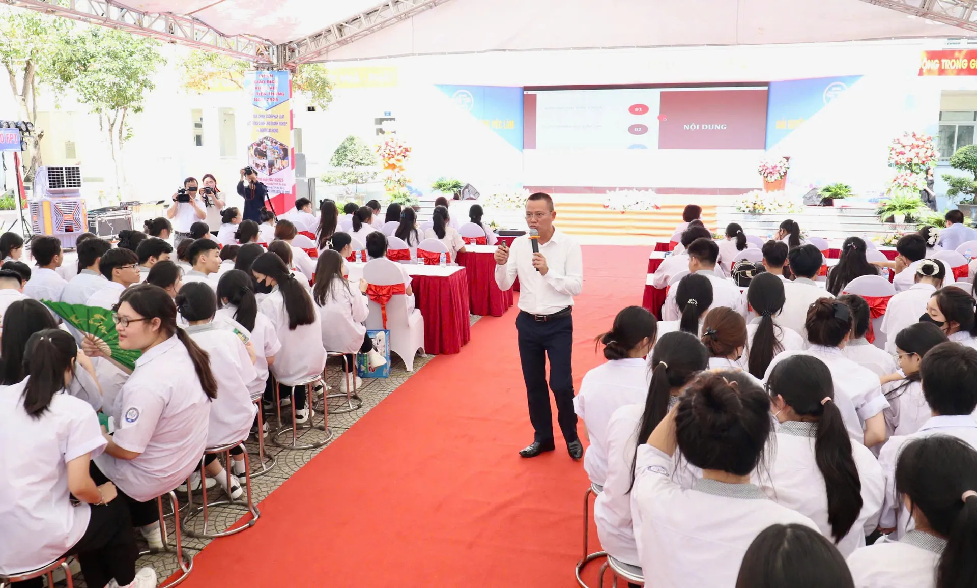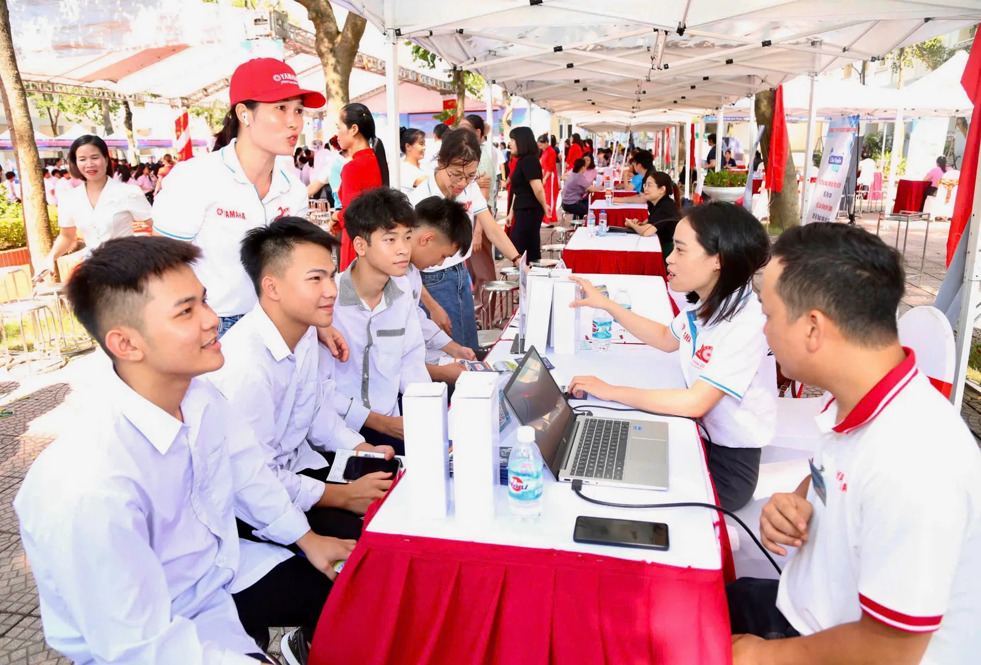 Các em học sinh được đại diện DN cung cấp thông tin về thị trường lao động. Ảnh: Phạm Hùng