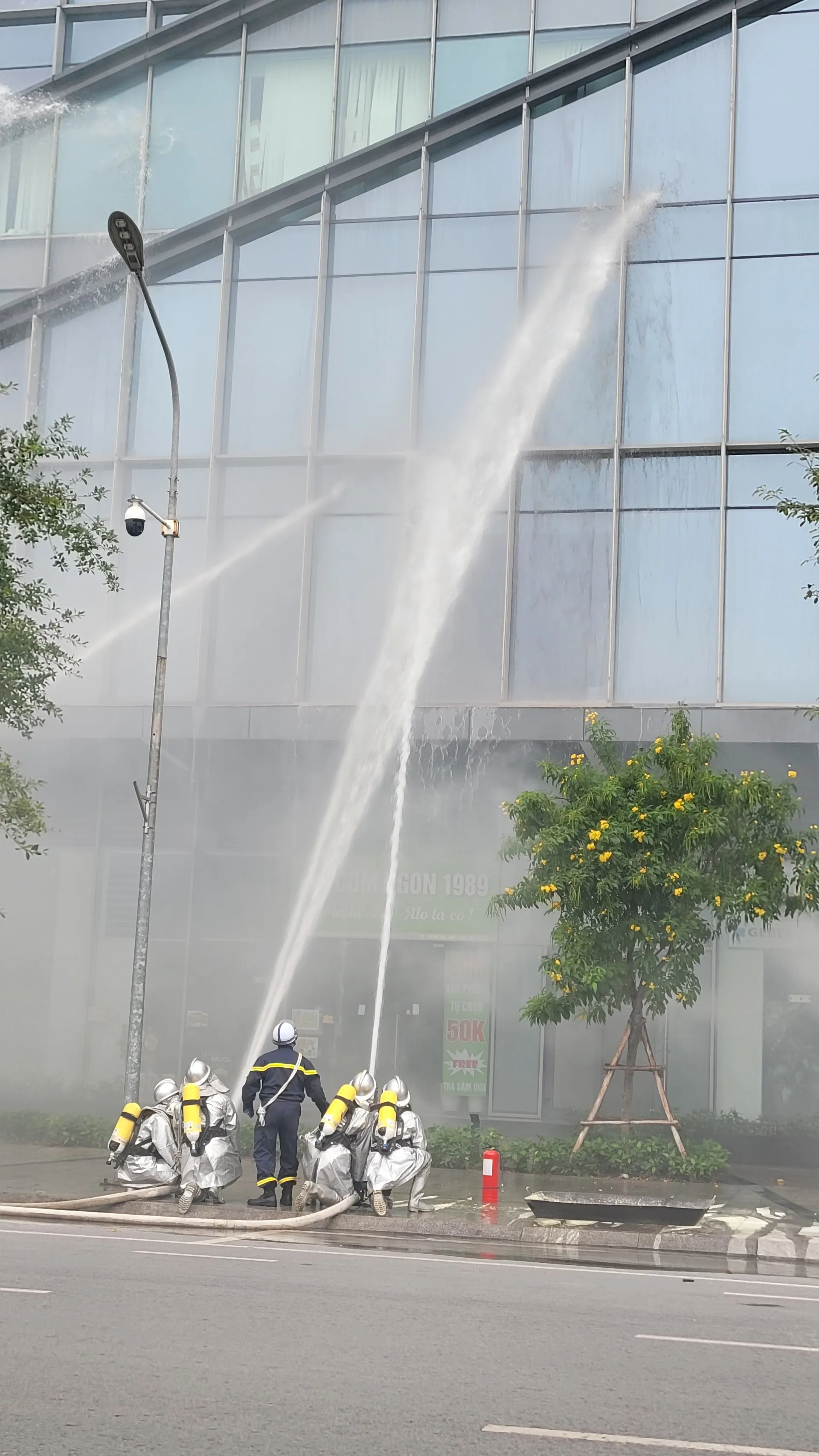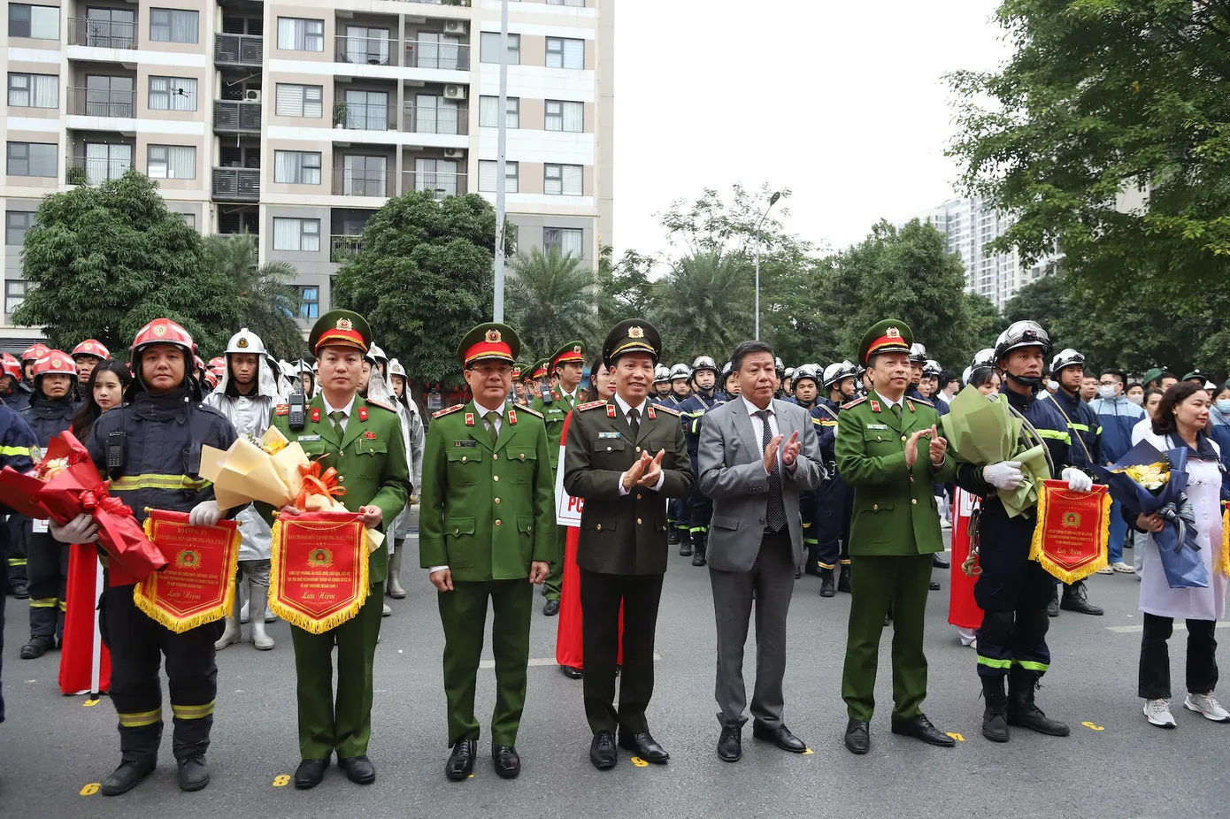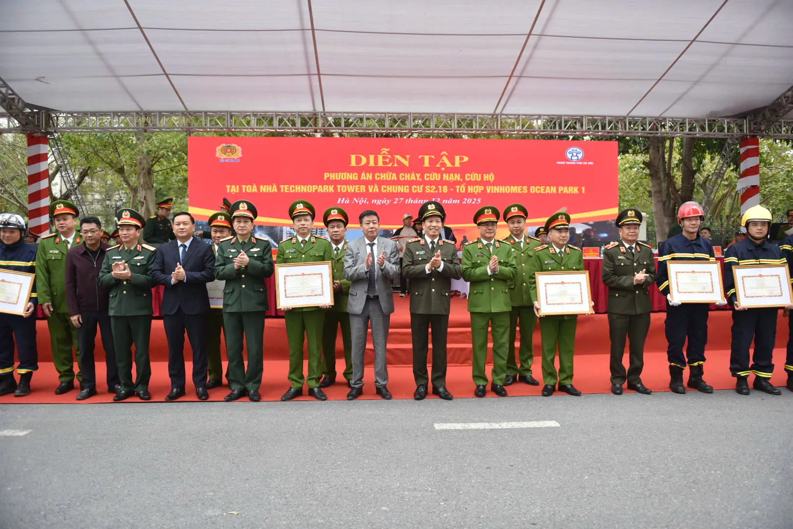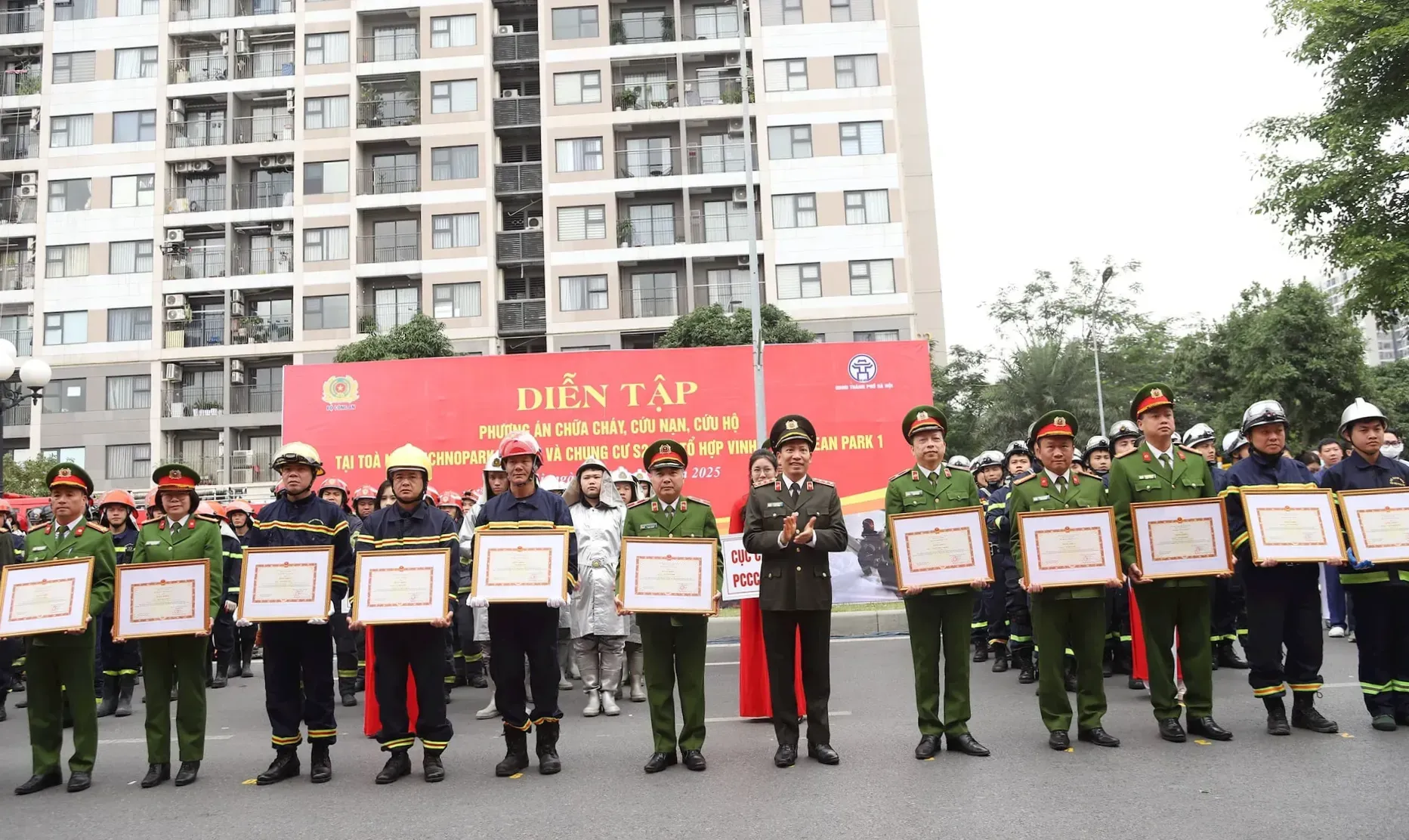 Buổi diễn tập tại tòa nhà Technopark Tower và chung cư S2.18 thuộc khu đô thị Vinhomes Ocean Park 1 (xã Gia Lâm, Hà Nội). Thượng tướng Lê Văn Tuyến, Thứ trưởng Bộ Công an; Ủy viên Ban Thường vụ Thành ủy, Phó Chủ tịch Thường trực UBND TP Hà Nội Dương Đức Tuấn đến dự và chỉ đạo diễn tập.