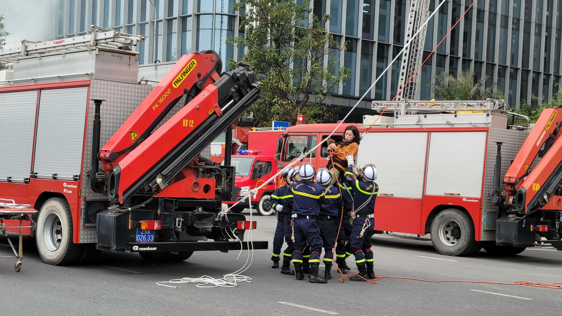 Sử dụng cầu dây nghiêng cứu người mắc kẹt trên tầng cao xuống an toàn.