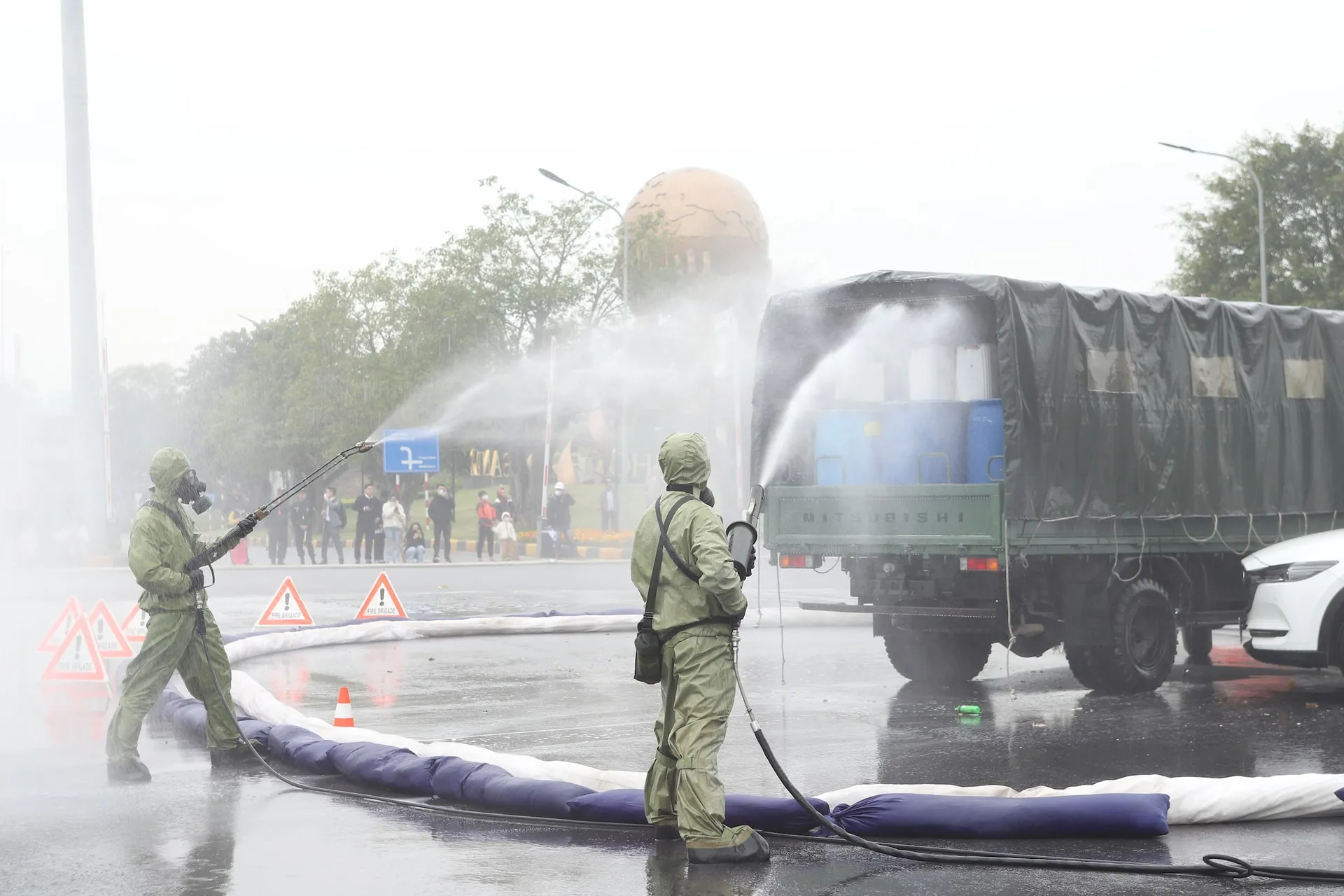 Các lực lượng triển khai đội hình xử lý sự cố hóa chất.