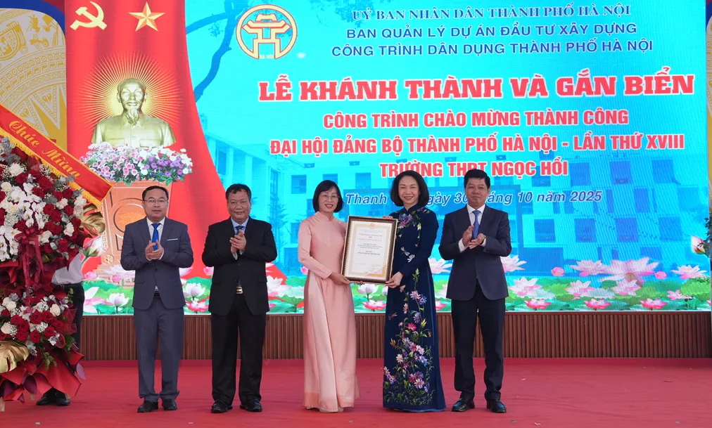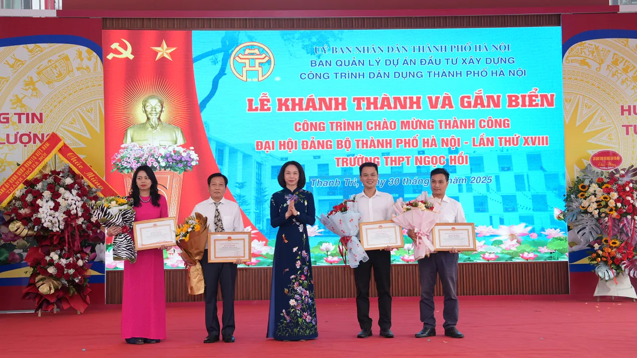 Đồng chí Vũ Thu Hà trao Bằng công nhận Trường THPT Ngọc Hồi là công trình chào mừng thành công Đại hội Đảng bộ thành phố Hà Nội lần thứ XVIII.