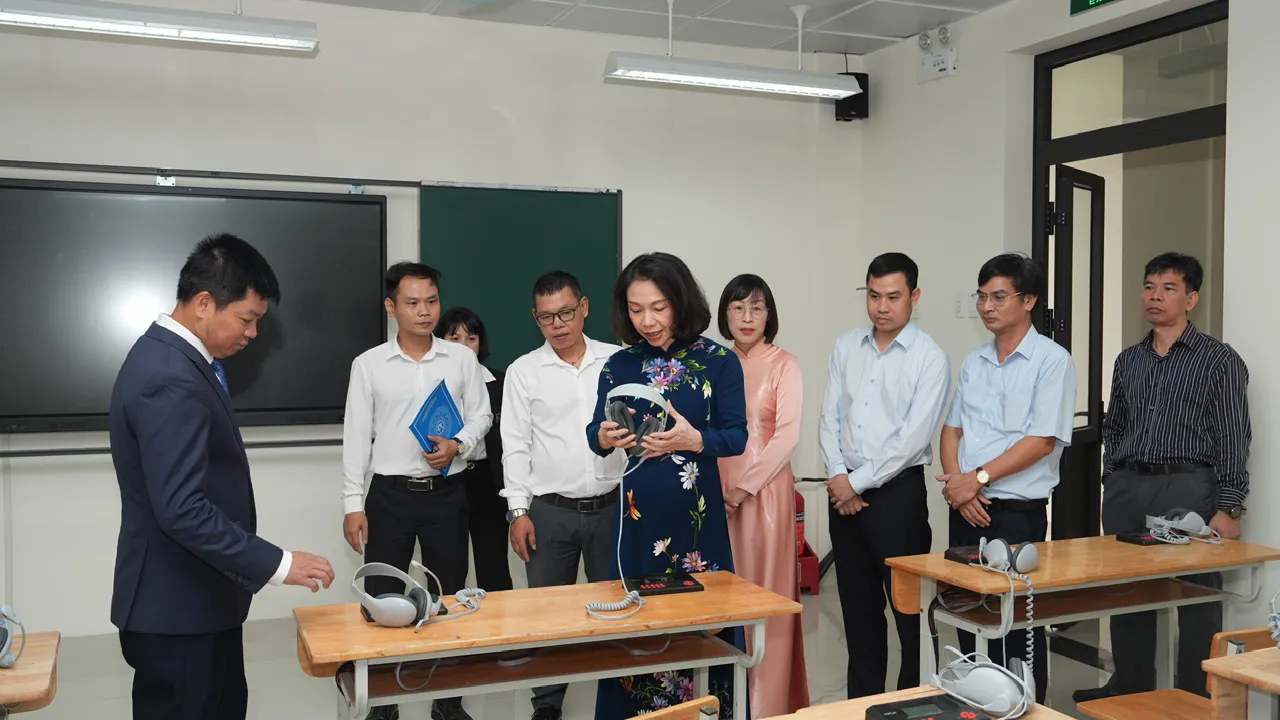 Đồng chí Vũ Thu Hà và lãnh đạo các sở, ngành tham quan cơ sở vật chất của Trường THPT Ngọc Hồi.