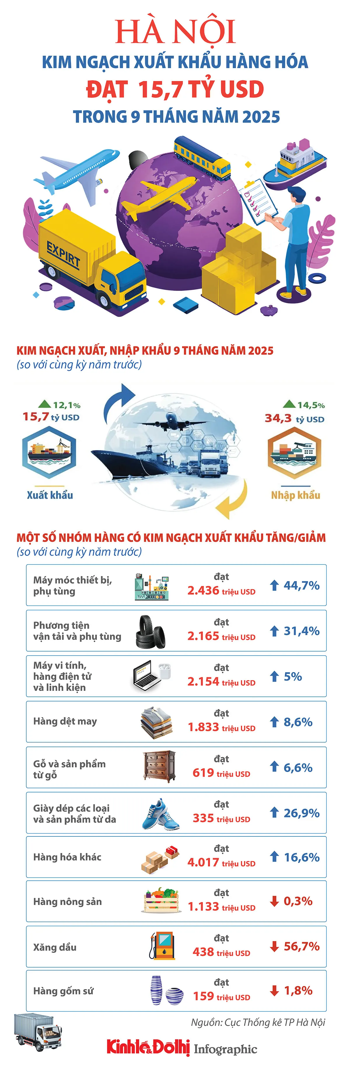 Hà Nội: Kim ngạch xuất khẩu hàng hóa 9 tháng năm 2025 ước đạt 15,7 tỷ USD