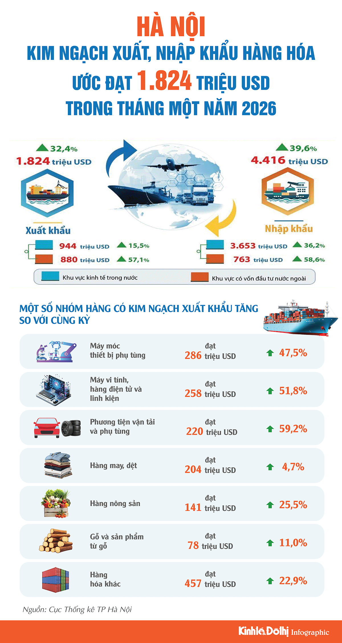 Kinhtedothi - Kim ngạch xuất khẩu hàng hóa Hà Nội tháng 1/2026 ước đạt 1.824 triệu USD, tăng ấn tượng 32,4% so với cùng kỳ năm 2025. Hoạt động xuất khẩu duy trì đà tăng trưởng cao, phản ánh nhu cầu sản xuất và tiêu dùng tăng mạnh ngay từ đầu năm, tạo nền tảng tăng trưởng vững chắc cho cả năm 2026…