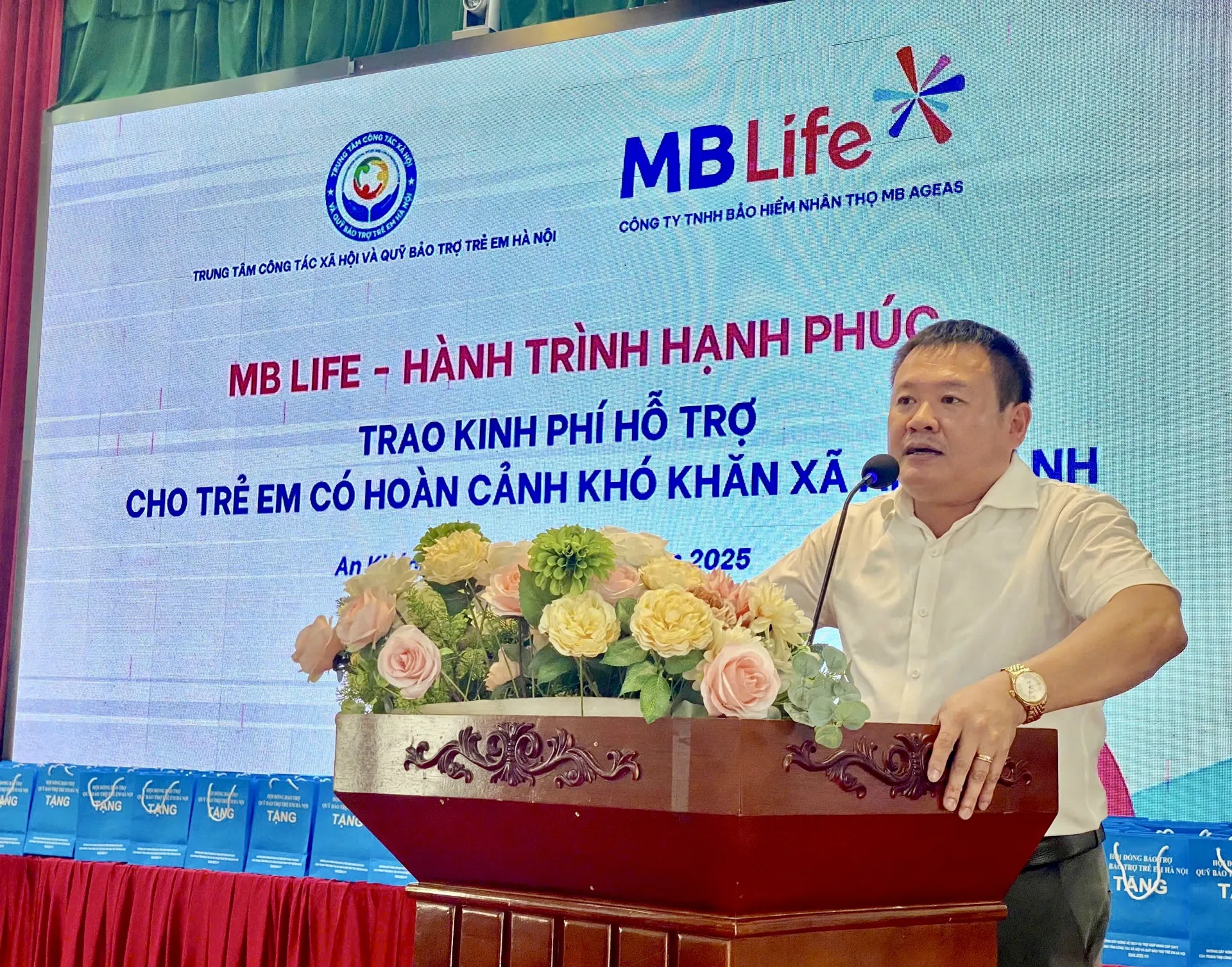 Giám đốc Trung tâm Công tác xã hội và Quỹ Bảo trợ trẻ em Hà Nội Nguyễn Văn Triệu; Tổng Giám đốc Công ty Bảo hiểm nhân thọ MB Life Bùi Trung Kiên và Phó Chủ tịch UBND xã An Khánh Bùi Thu Hương trao quà cho trẻ em.