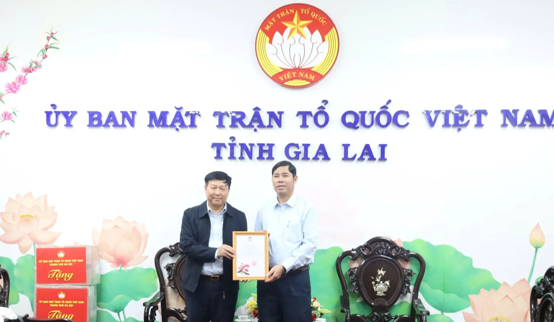 Phó Chủ tịch Thường trực Ủy ban Mặt trận Tổ quốc Việt Nam tỉnh Gia Lai Trần Minh Sơn trao thư cảm ơn đến Phó Chủ tịch Thường trực Ủy ban Mặt trận Tổ quốc Việt Nam TP Hà Nội Phạm Anh Tuấn - Trưởng đoàn công tác