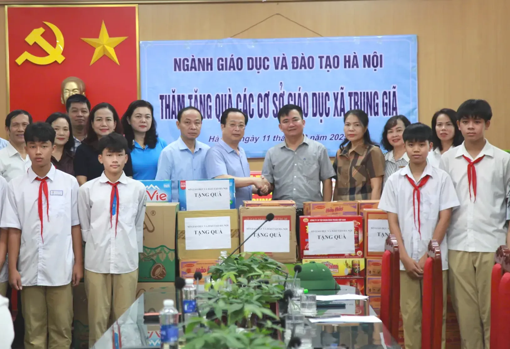 Đoàn công tác ngành giáo dục Hà Nội thăm và tặng quà các cơ sở giáo dục xã Trung Giã - nơi chịu ảnh hưởng nặng nề bởi bão lũ.