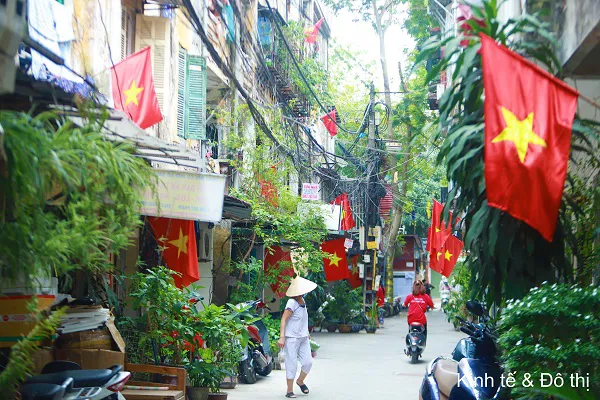 Khung cảnh rực rỡ cờ đỏ sao vàng tại khu tập thể Trung Tự.