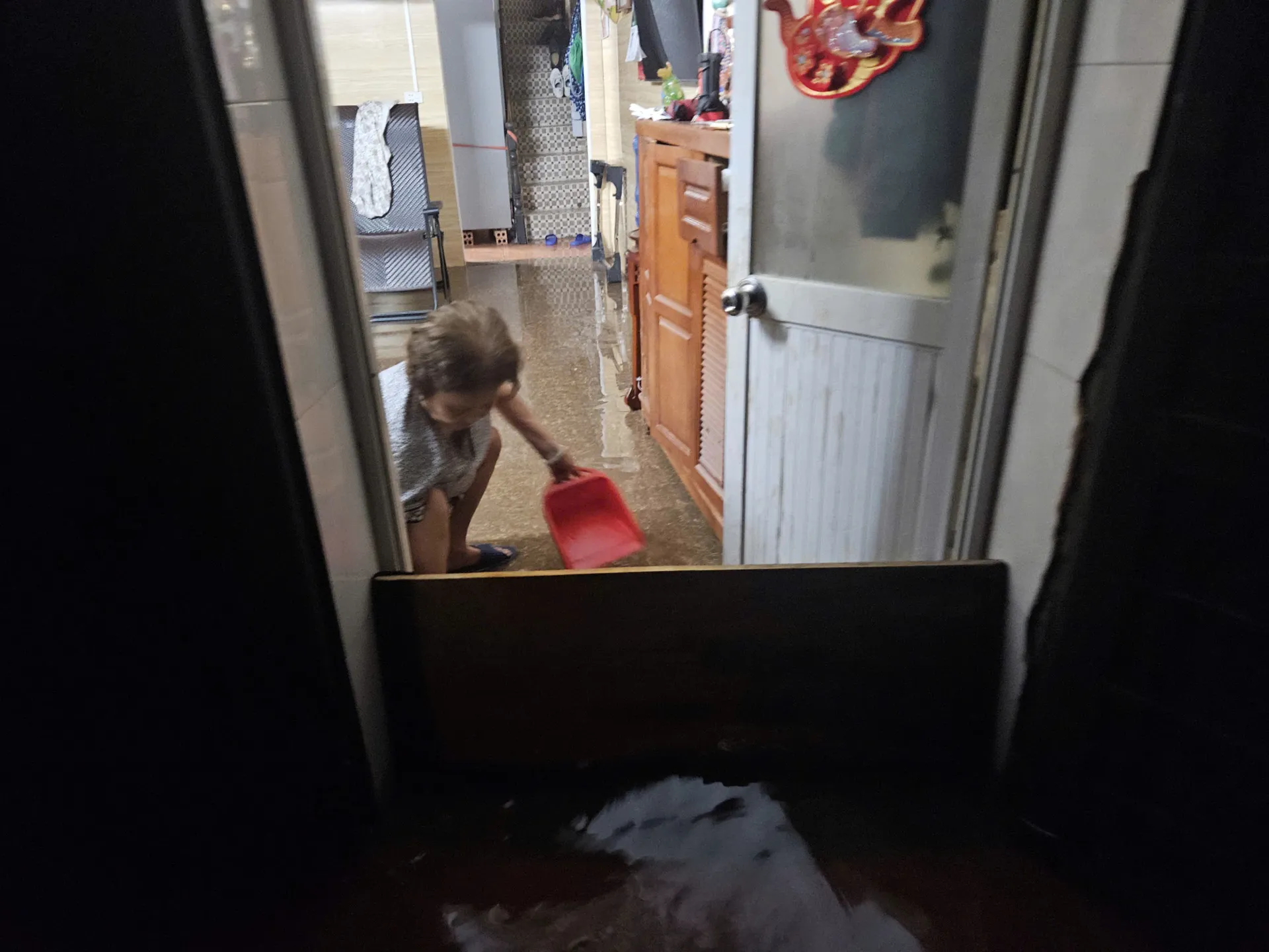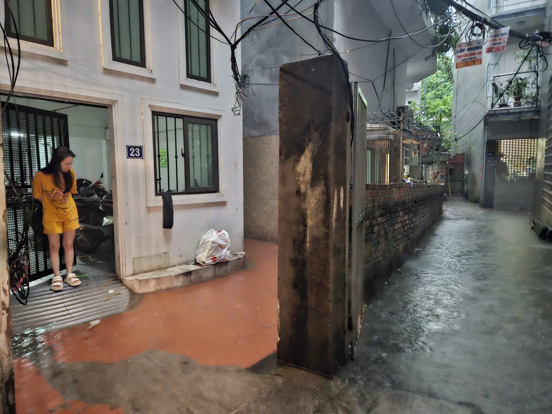 Ngõ 166 phố Kim Mã, người dân đang phải hất nước ra ngoài. Ảnh: Ngọc Tú