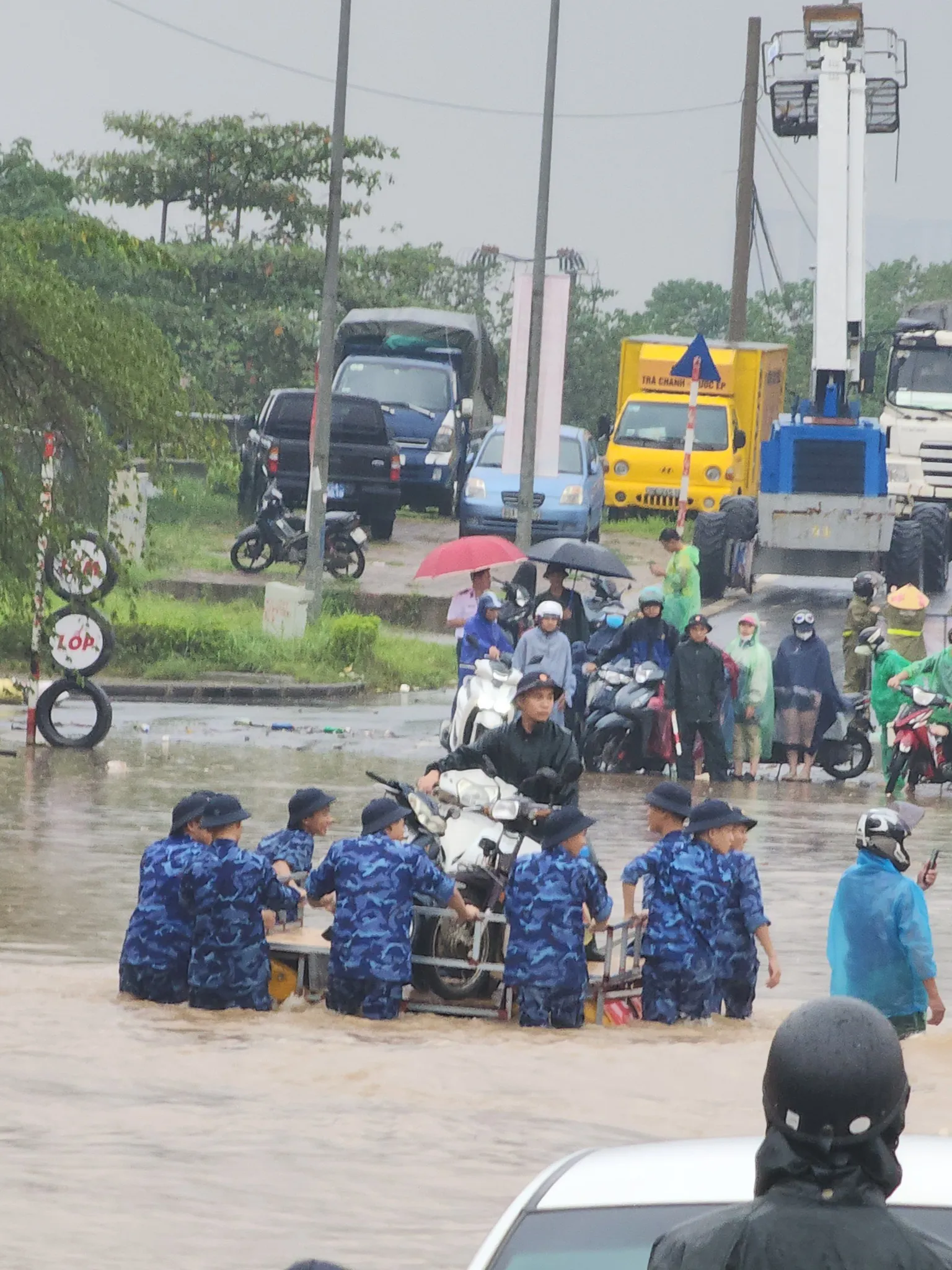 Chật vật đi qua vùng ngập sâu. Ảnh: CTV