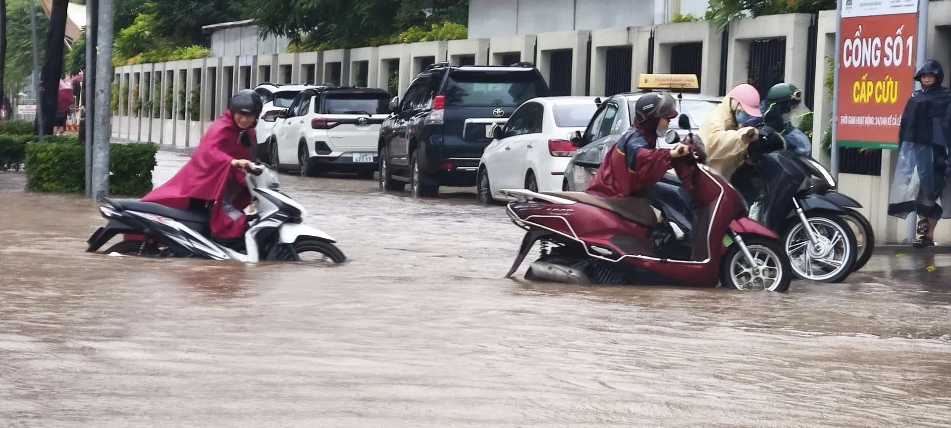 Các phương tiện di chuyển khó khăn qua vùng ngập. Ảnh: CTV