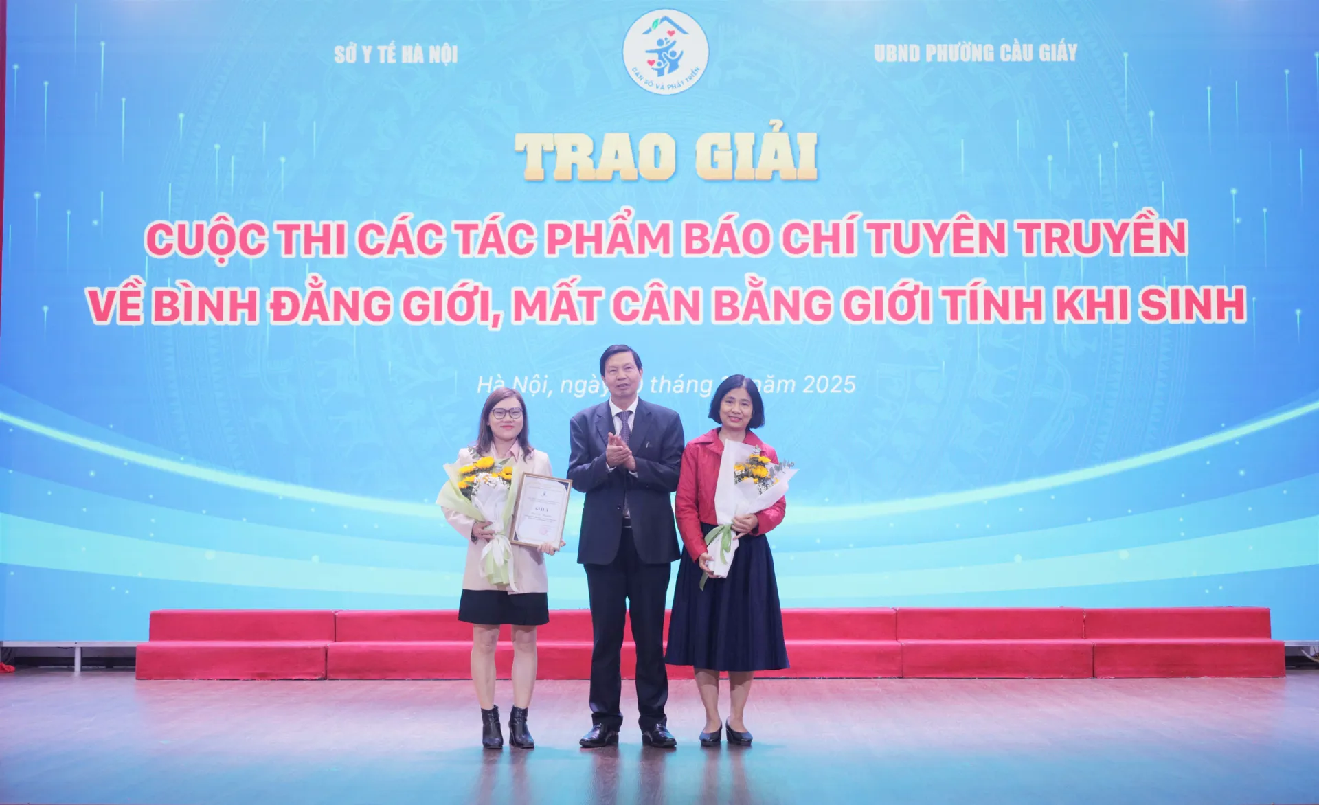 Phó Giám đốc Sở Y tế Hà Nội Trần Văn Chung trao giải cho tác giả đoạt giải A cuộc thi phẩm tuyên truyền về bình đẳng giới, mất cân bằng giới tính khi sinh.
