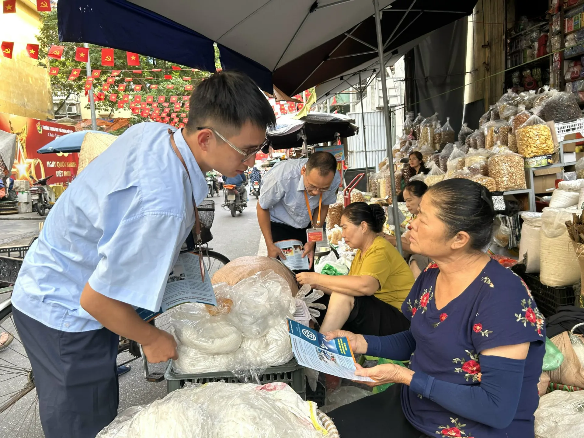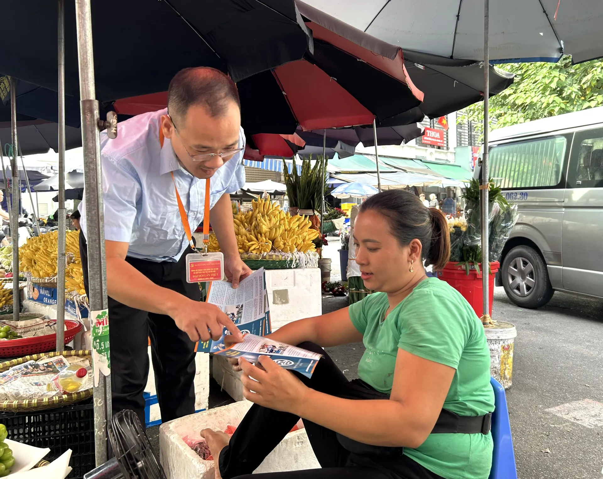 Các thành viên Đội Trật tự xã hội lưu động phát tờ rơi cho bà con tiểu thương, tỉ mỉ giải thích các nội dung của Quyết định 2252/QĐ-UBND. Ảnh: Trần Oanh.