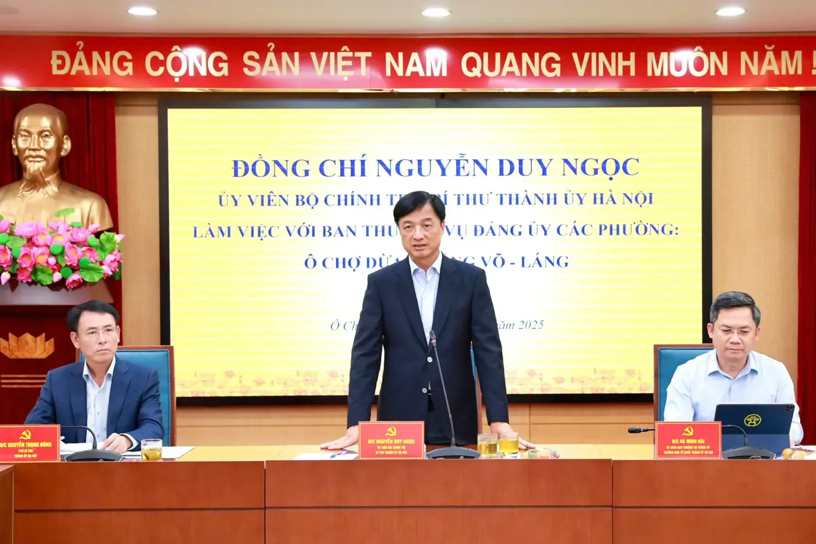 Kinhtedothi - Chiều 27/11, Ủy viên Bộ Chính trị, Bí thư Thành ủy Hà Nội Nguyễn Duy Ngọc đã chủ trì làm việc với Ban Thường vụ Đảng ủy các phường (Ô Chợ Dừa, Giảng Võ, Láng) về công tác xây dựng Đảng, xây dựng hệ thống chính trị; tình hình phát triển kinh tế - xã hội, đảm bảo quốc phòng, an ninh của địa phương và công tác giải phóng mặt bằng đường Vành đai 1 (đoạn Hoàng Cầu - Voi Phục).