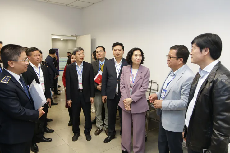 Thứ trưởng Bộ Y tế Nguyễn Thị Liên Hương và đoàn công tác của Bộ Y tế kiểm tra khu vực cách ly tạm thời.