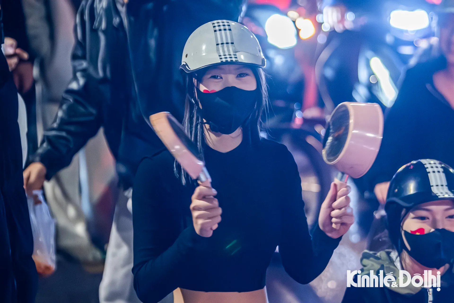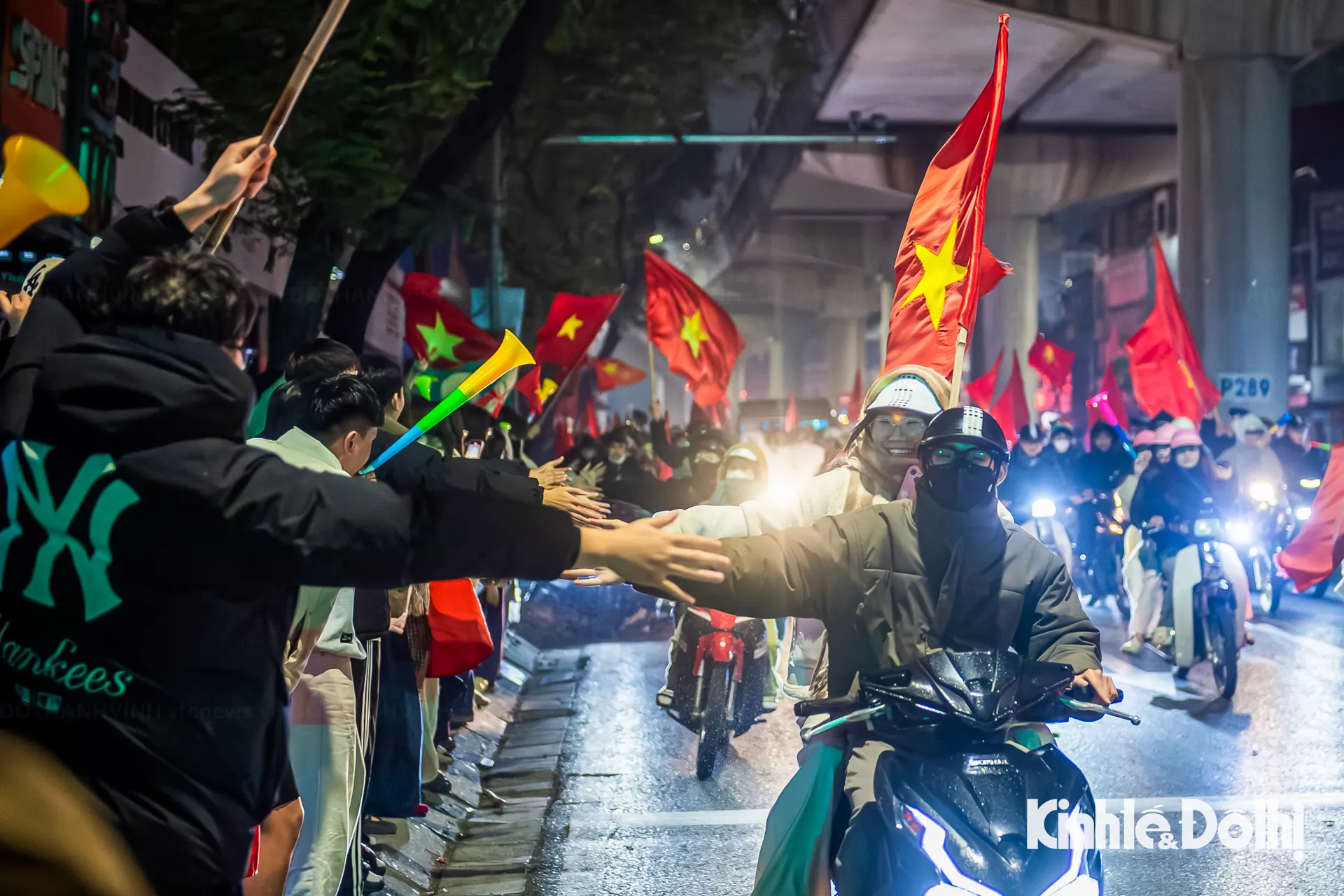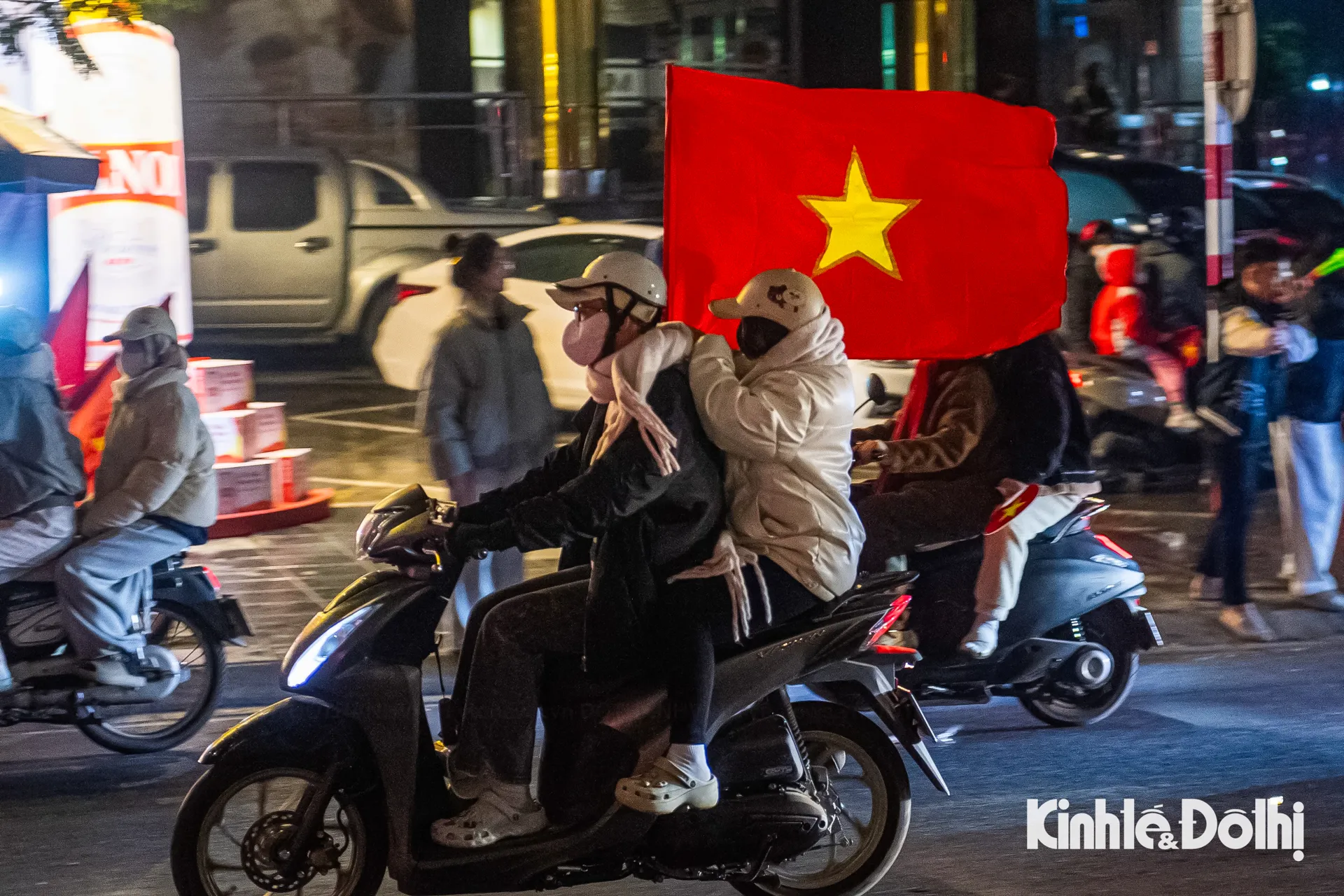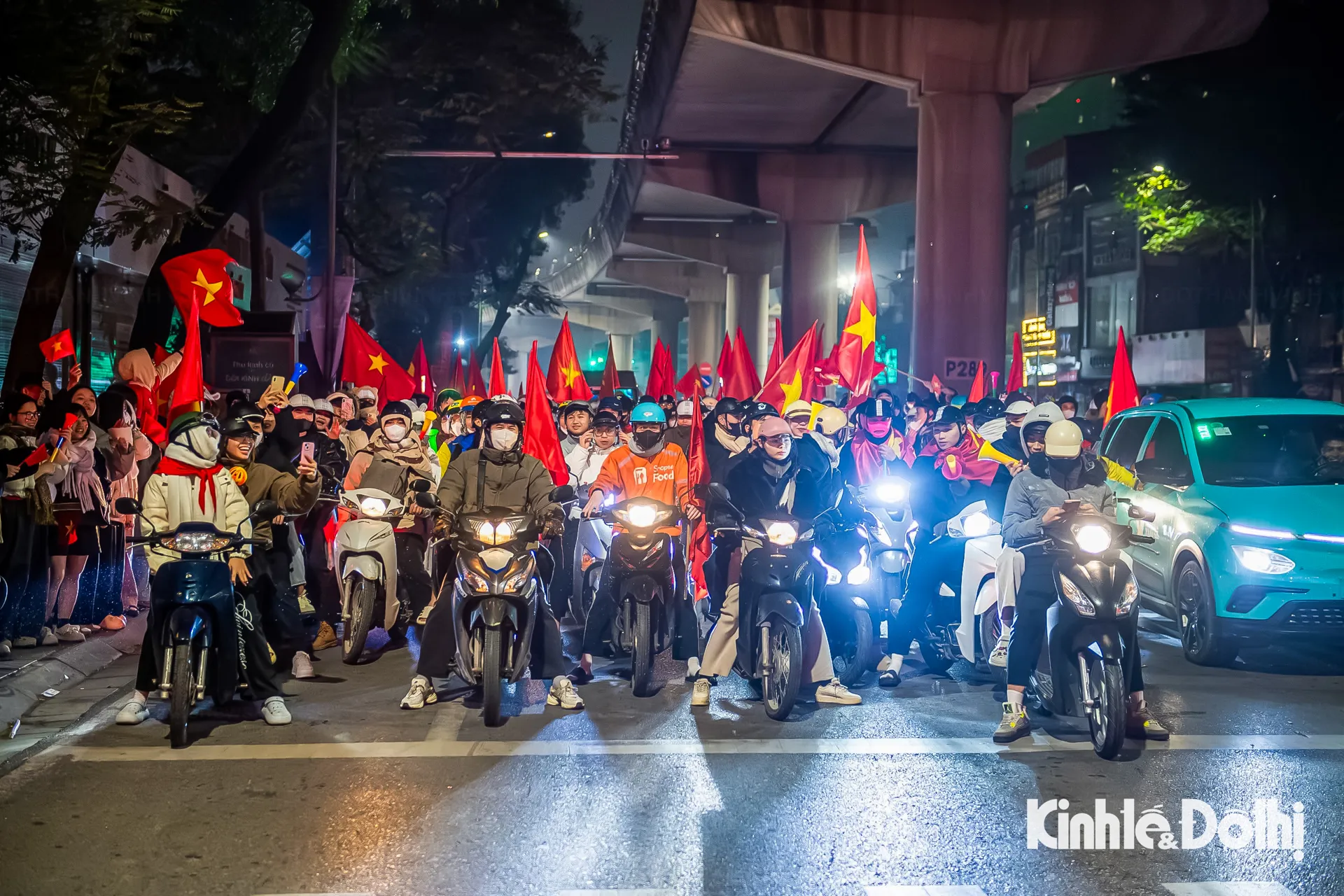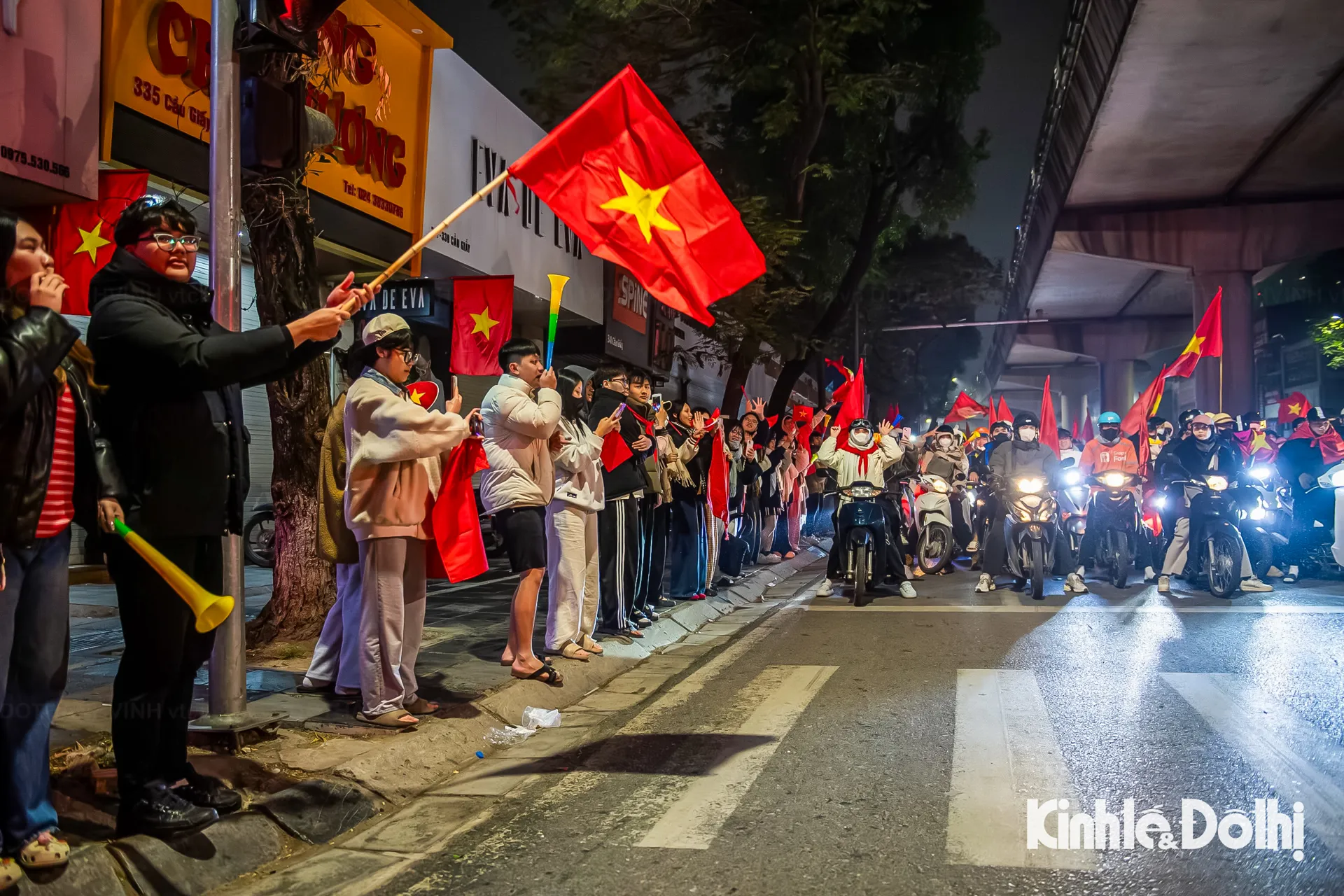 Hàng nghìn người dân đổ ra các tuyến phố lớn như Nguyễn Trãi, Cầu Giấy, Kim Mã, Xã Đàn... Dòng người mang cờ Tổ quốc nối dài thành từng đoàn, tiếng hò reo vang vọng trong đêm khuya, tạo nên khung cảnh sôi động hiếm thấy giữa thời tiết giá rét.