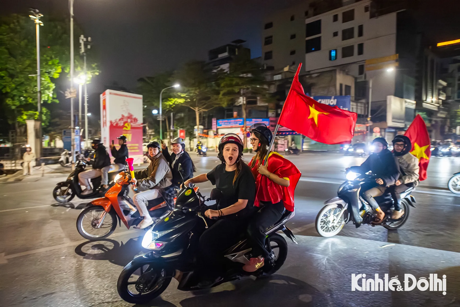 Nhiều nhóm bạn trẻ chạy xe máy chậm rãi, vẫy cờ, chụp ảnh, ghi lại những khoảnh khắc đáng nhớ của một đêm ăn mừng đầy cảm xúc.