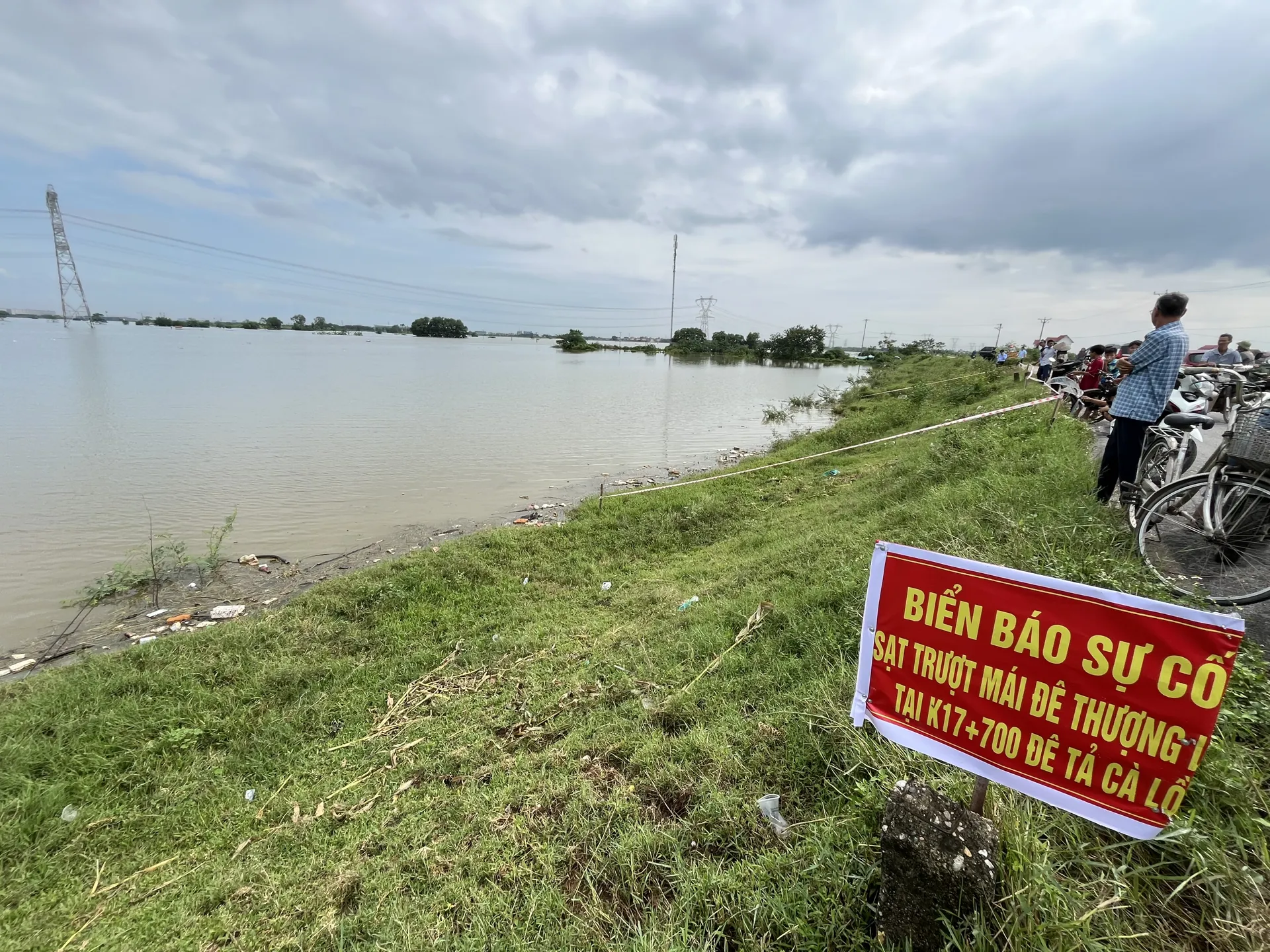 Hiện trường sự cố sạt trượt mái đê tả Cà Lồ tại xã Đa Phúc (TP Hà Nội).