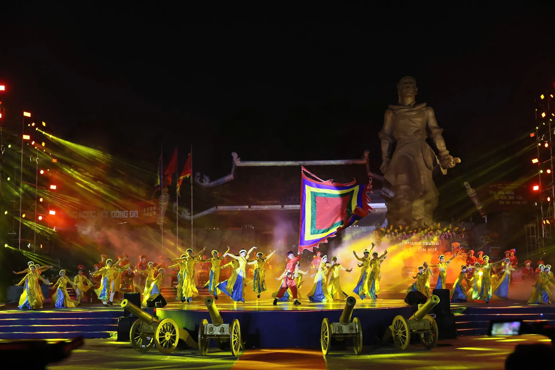 Ứng dụng công nghệ 3D mapping trong chương trình nghệ thuật khai mạc Lễ hội Gò Đống Đa 2025. Ảnh: Phạm Hùng