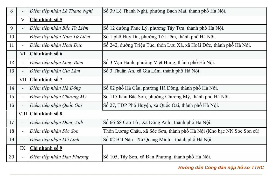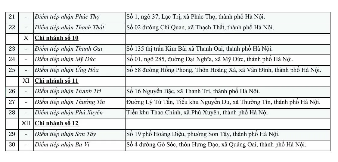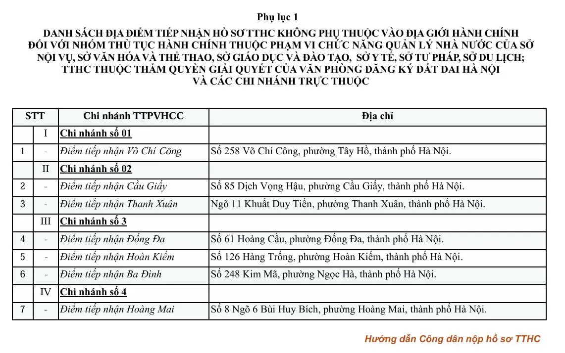 Danh sách các điểm tiếp nhận thủ tục hành chính phi địa giới hành chính.