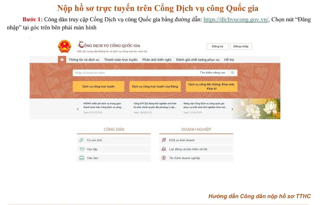 Để nộp hồ sơ trực tuyến trên Cổng dịch vụ công quốc gia, người dân, doanh nghiệp làm theo các bước: