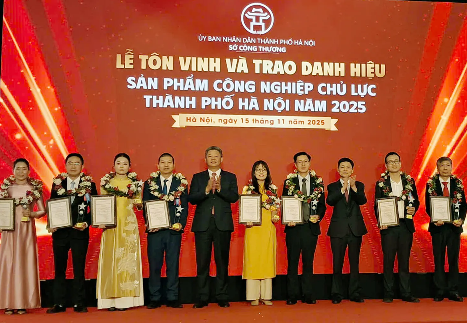 Ủy viên Ban Thường vụ Thành ủy, Phó Chủ tịch UBND TP Hà Nội Nguyễn Mạnh Quyền và Phó Chủ tịch HĐND TP Hà Nội Phạm Quí Tiên trao giấy chứng nhận cho TOP 10 sản phẩm công nghiệp chủ lực TP Hà Nội năm 2025. Ảnh: Hoài Nam