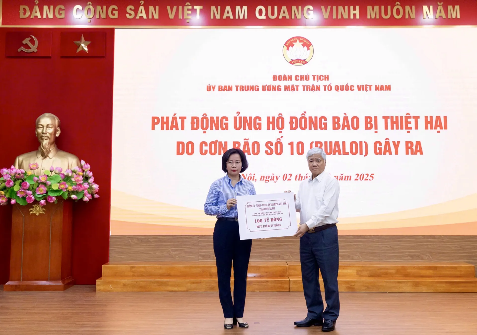 Kinhtedothi - Hưởng ứng Lời kêu gọi của Đoàn Chủ tịch Ủy ban Trung ương Mặt trận Tổ quốc (T.Ư MTTQ) Việt Nam về vận động ủng hộ đồng bào khắc phục thiệt hại do cơn bão số 10 gây ra, chiều nay, 2/10, thay mặt lãnh đạo Thành ủy - HĐND - UBND - Ủy ban MTTQ Việt Nam Thành phố Hà Nội, Ủy viên Ban Thường vụ Thành ủy, Chủ tịch Ủy ban MTTQ Việt Nam Thành phố Bùi Huyền Mai đã trao số tiền ủng hộ 100 tỷ đồng hỗ trợ Nhân dân các tỉnh qua Ủy ban T.Ư MTTQ Việt Nam.