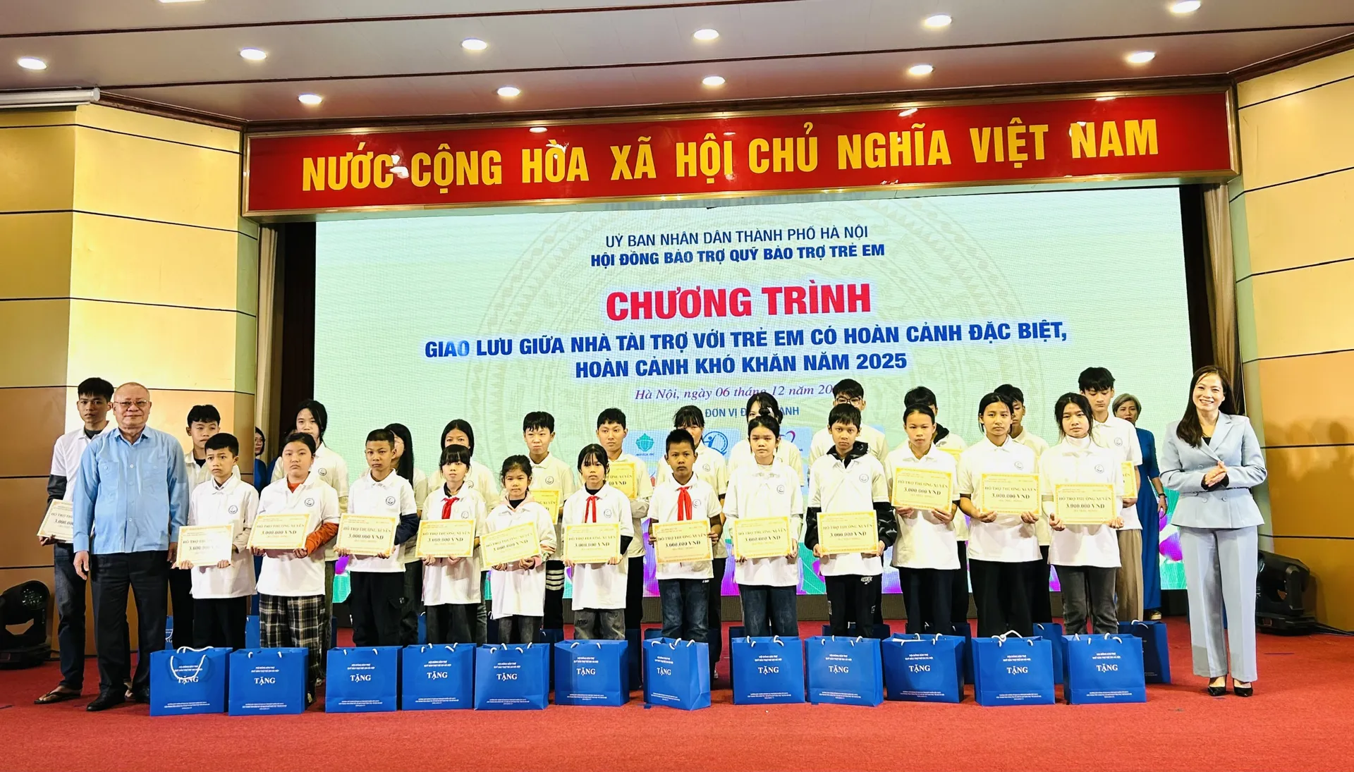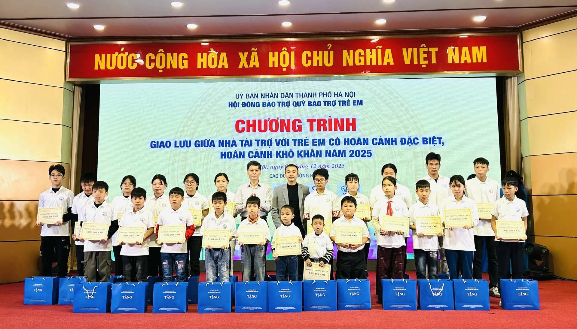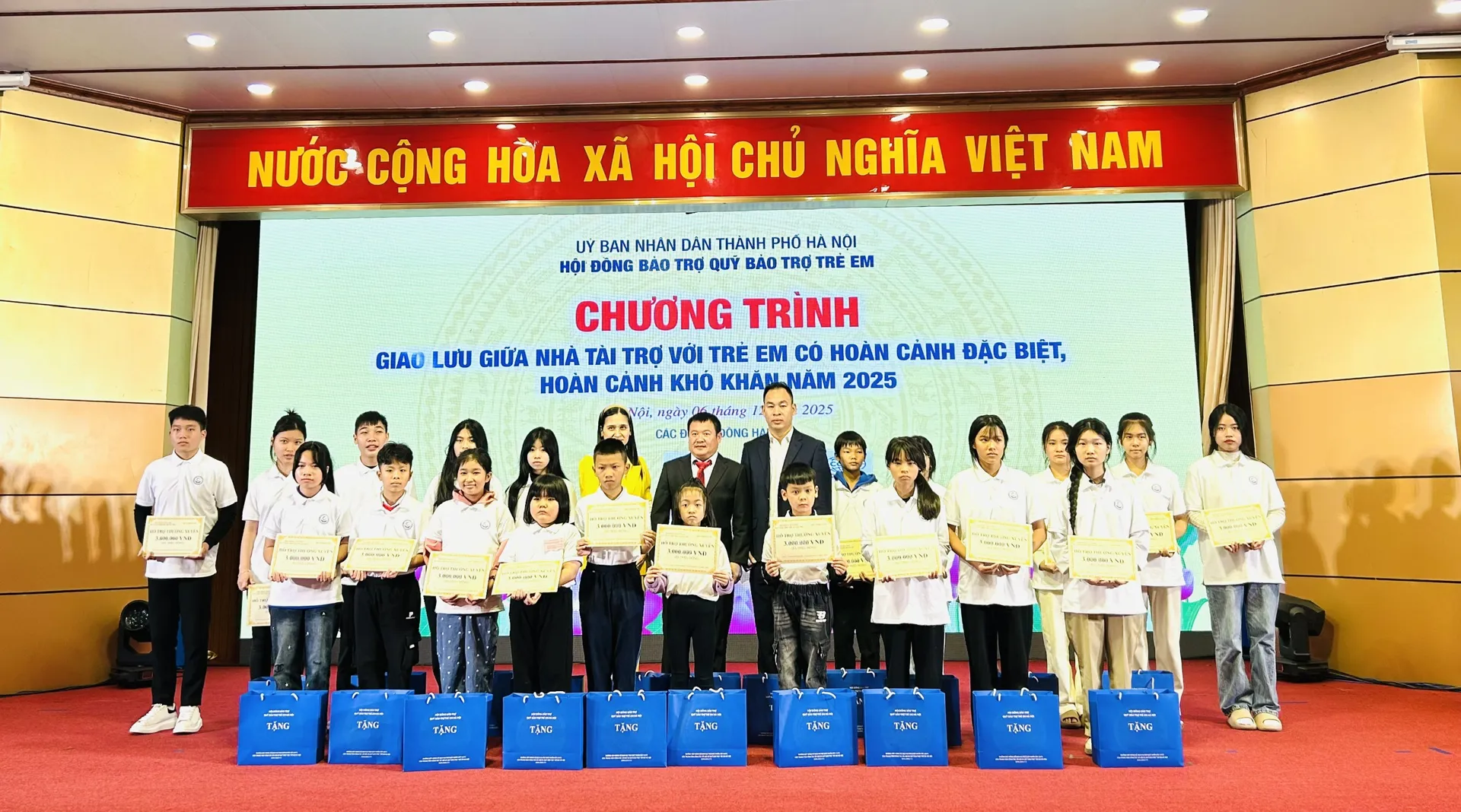 Tại Chương trình Giao lưu giữa nhà tài trợ với trẻ em có hoàn cảnh đặc biệt, hoàn cảnh khó khăn năm 2025, Ban tổ chức tặng kinh phí hỗ trợ, học bổng, xe đạp và quà tặng cho 200 trẻ em có hoàn cảnh đặc biệt, hoàn cảnh khó khăn. Cụ thể, Ban tổ chức trao tặng 130 suất hỗ trợ thường xuyên của Quỹ Thiện Tâm cho 130 em, với tổng số tiền 395.100.000 đồng. Ban tổ chức tặng 50 suất học bổng (mỗi suất trị giá 2 triệu đồng), 20 xe đạp cho 70 em, với tổng số tiền là 140.000.000 đồng. Ngoài ra, mỗi trẻ em tham gia chương trình được tặng 1 suất quà trị giá 1.000.000 đồng. Tổng kinh phí trao tặng tại Chương trình Giao lưu giữa nhà tài trợ với trẻ em có hoàn cảnh đặc biệt, hoàn cảnh khó khăn năm 2025 là: 735.100.000 đồng.