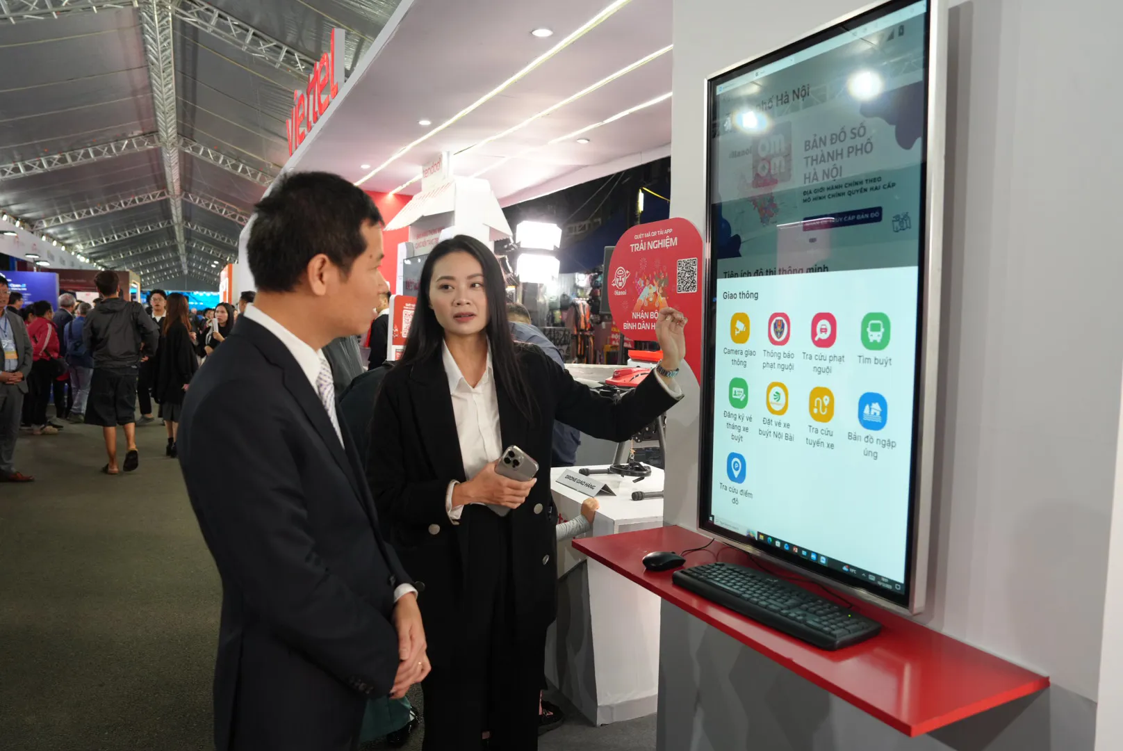 Du khách tham quan, trải nghiệm ứng dụng iHanoi tại triển lãm Techfest 2025.