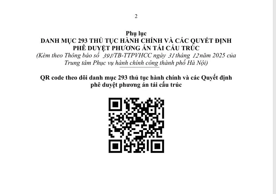 Thông cáo báo chí nêu rõ: Thực hiện chỉ đạo của Bí thư Thành ủy tại Thông báo Kết luận số 12-TB/BCĐ ngày 15/11/2025 của Ban Chỉ đạo 57 Thành ủy, Giám đốc Trung tâm Phục vụ hành chính công TP (theo ủy quyền của Chủ tịch UBND TP) đã ký ban hành các Quyết định phê duyệt phương án tái cấu trúc đối với 293 thủ tục hành chính thuộc các lĩnh vực để cung cấp dịch vụ công trực tuyến, dịch vụ công trực tuyến toàn trình, liền mạch, tối ưu chi phí (chi tiết tại mã QR), Trung tâm Phục vụ hành chính công TP trân trọng triển khai đồng loạt từ ngày 1/1/2026: