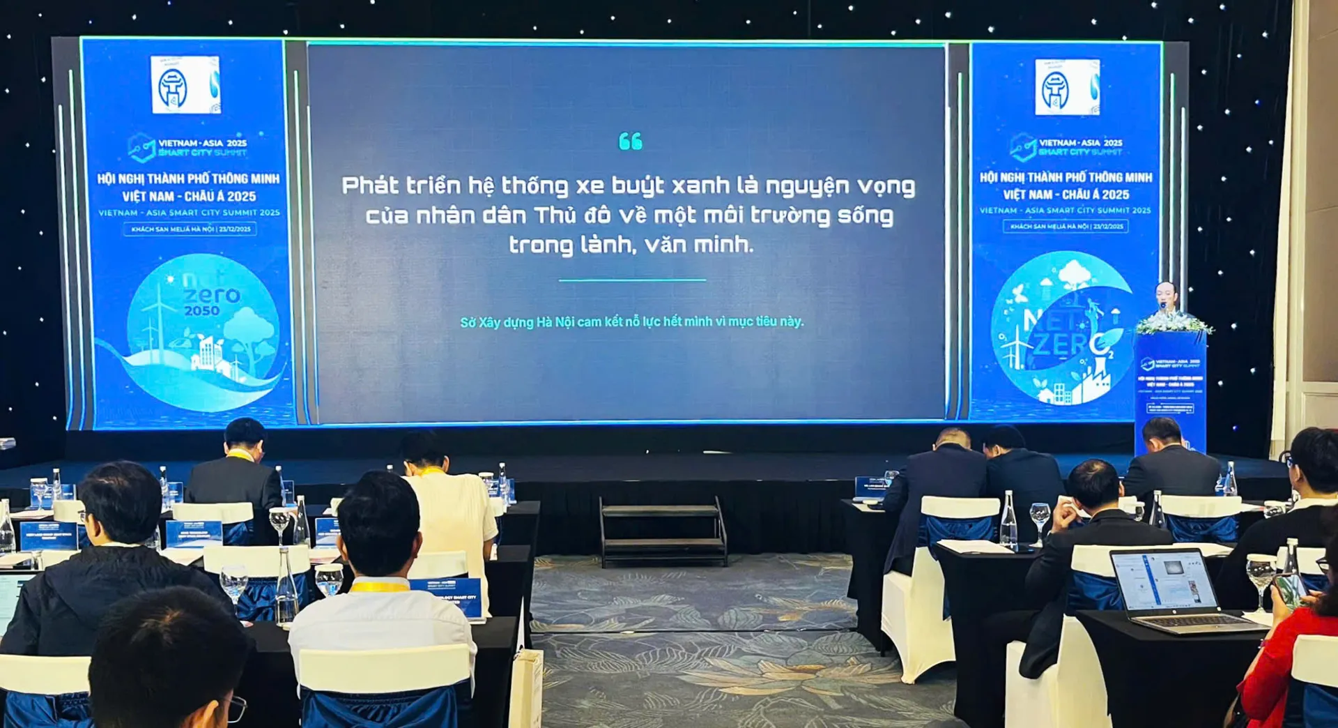 Ông Nguyễn Minh Tuấn - Phó Giám đốc Trung tâm quản lý điều hành giao thông TP Hà Nội phát biểu tại Hội nghị Thành phố thông minh Việt Nam - Châu Á 2025 về mục tiêu của Hà Nội phát triển hệ thống xe buýt xanh.