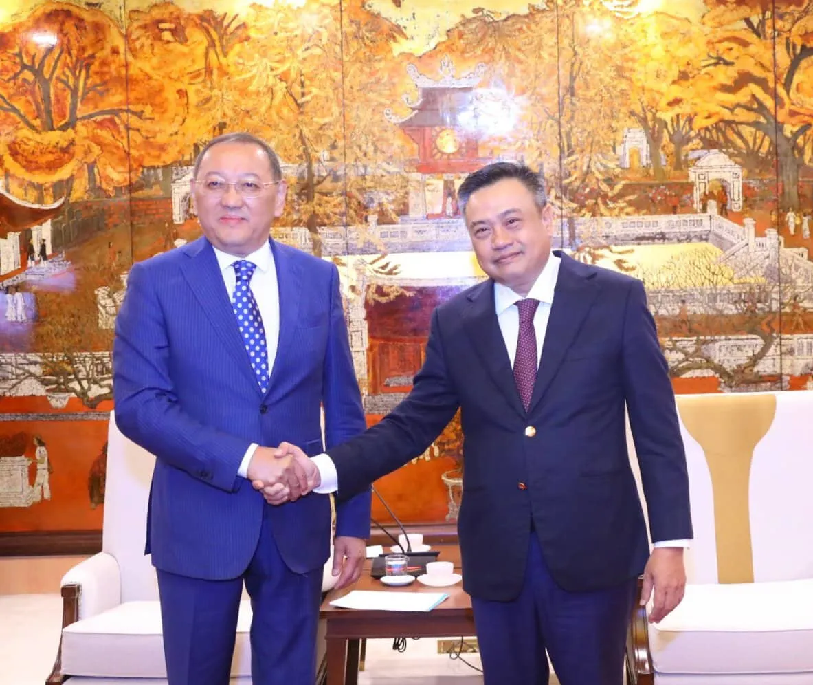 Chủ tịch UBND TP Hà Nội Trần Sỹ Thanh và Đại sứ Cộng hòa Kazakhstan tại Việt Nam Yerlan Baizhanov trao đổi hoạt động hợp tác cụ thể để tăng cường quan hệ hữu nghị giữa Astana và Hà Nội.