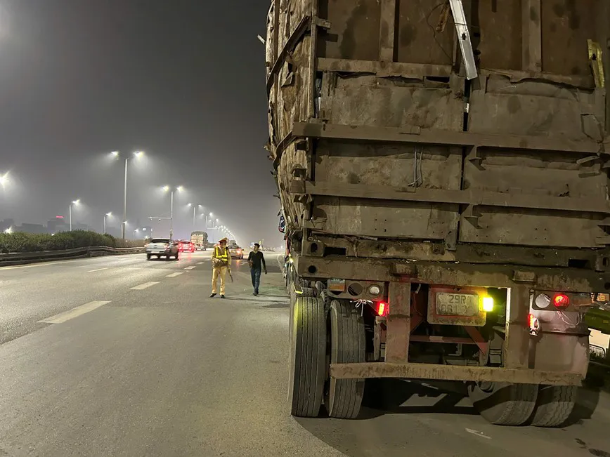 Theo đó, Tổ công tác thuộc Đội CSGT đường bộ số 14 (Phòng CSGT Công an TP Hà Nội) làm nhiệm vụ tuần tra kiểm soát trên đường vành đai 3 ( đoạn qua quận Hoàng Mai, Hà Nội) đã phát hiện xe đầu kéo mang BKS 29H-598.XX, kéo theo rơ- mooc BKS 29R-066.XX chở thùng container phế liệu có biểu hiện vi phạm nên ra hiệu lệnh dừng xe để kiểm tra.