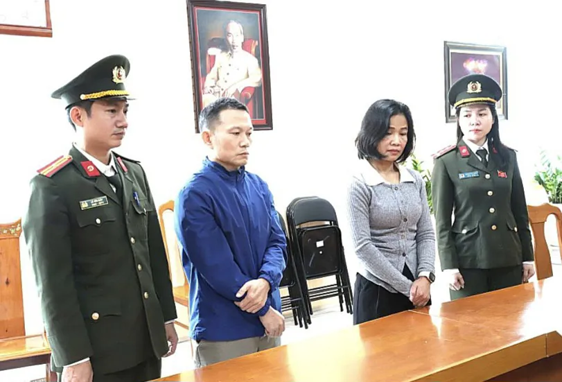 Phan Thị Thu Hường và Võ Văn Hoài tại cơ quan An ninh điều tra. Ảnh Công an Hà Tĩnh.