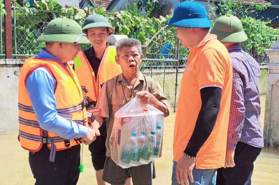 Các suất quà cứu trợ chủ yếu là mì tôm, lương khô, nước khoáng và một số vật dụng khác được trao đến tận tay người dân vùng lũ.