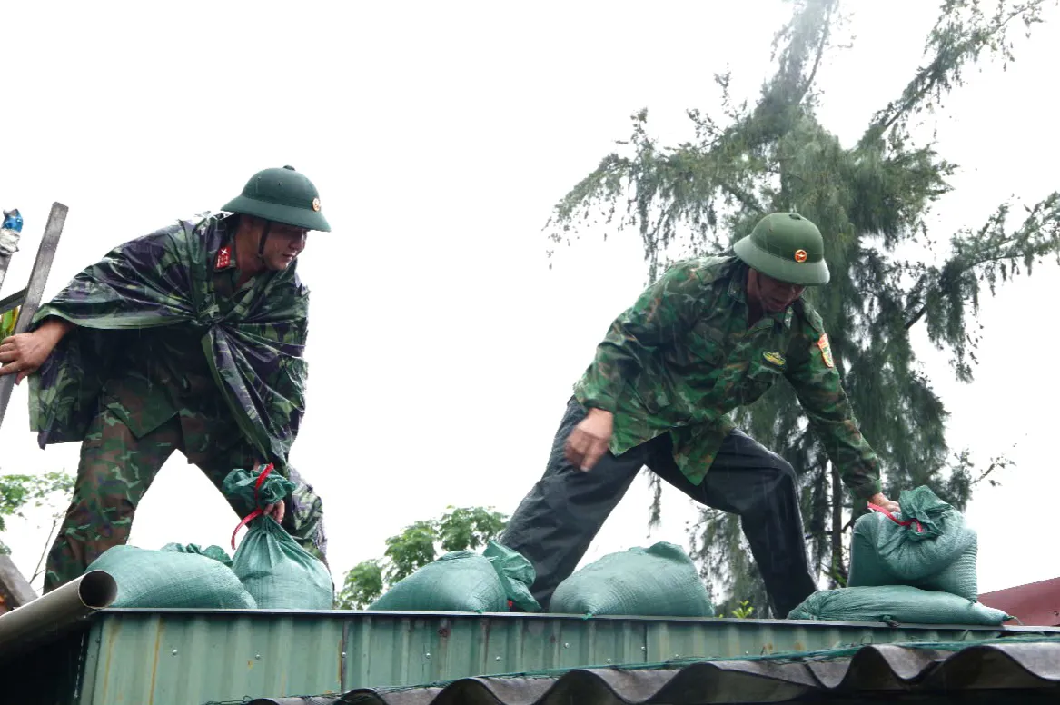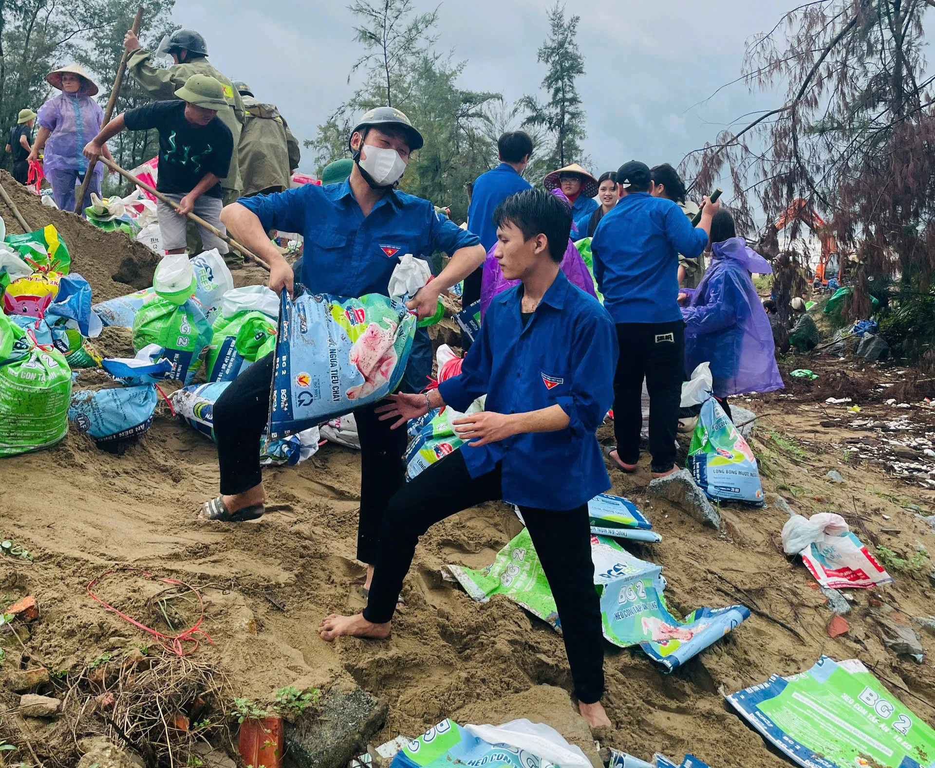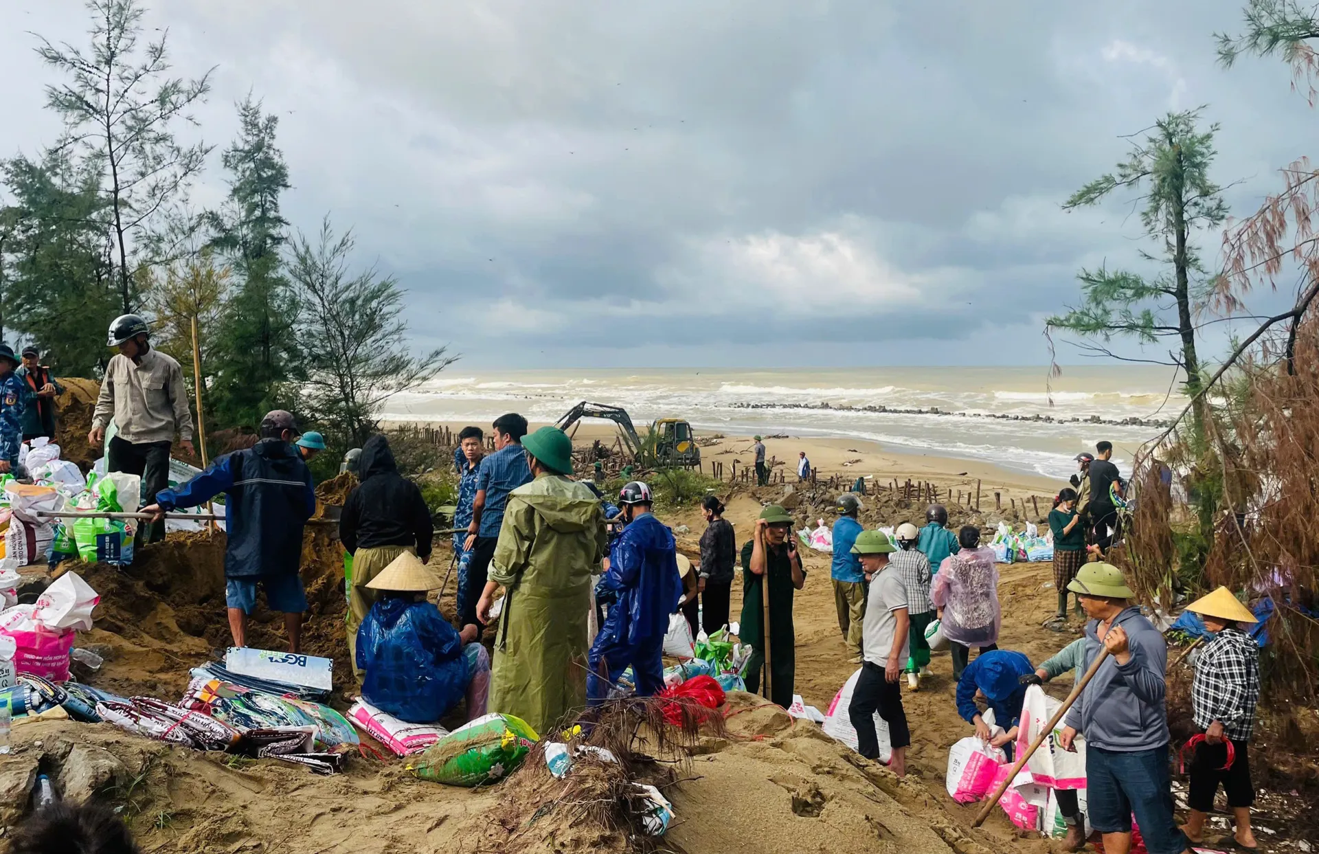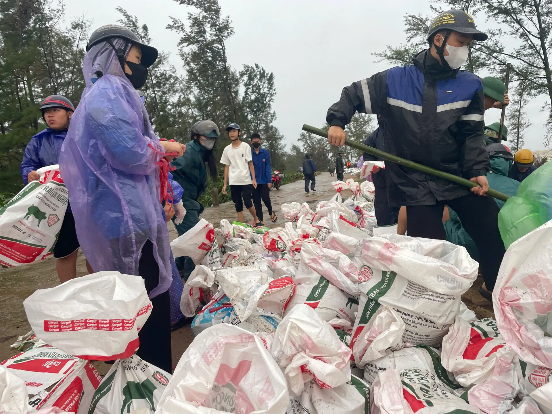 Tại tuyến đê biển Hội Thống, các lực lượng quân sự, Công an và hàng trăm người dân tập trung sử dụng bao tải cát gia cố đê, phòng ngừa các sự cố do mưa bão gây ra